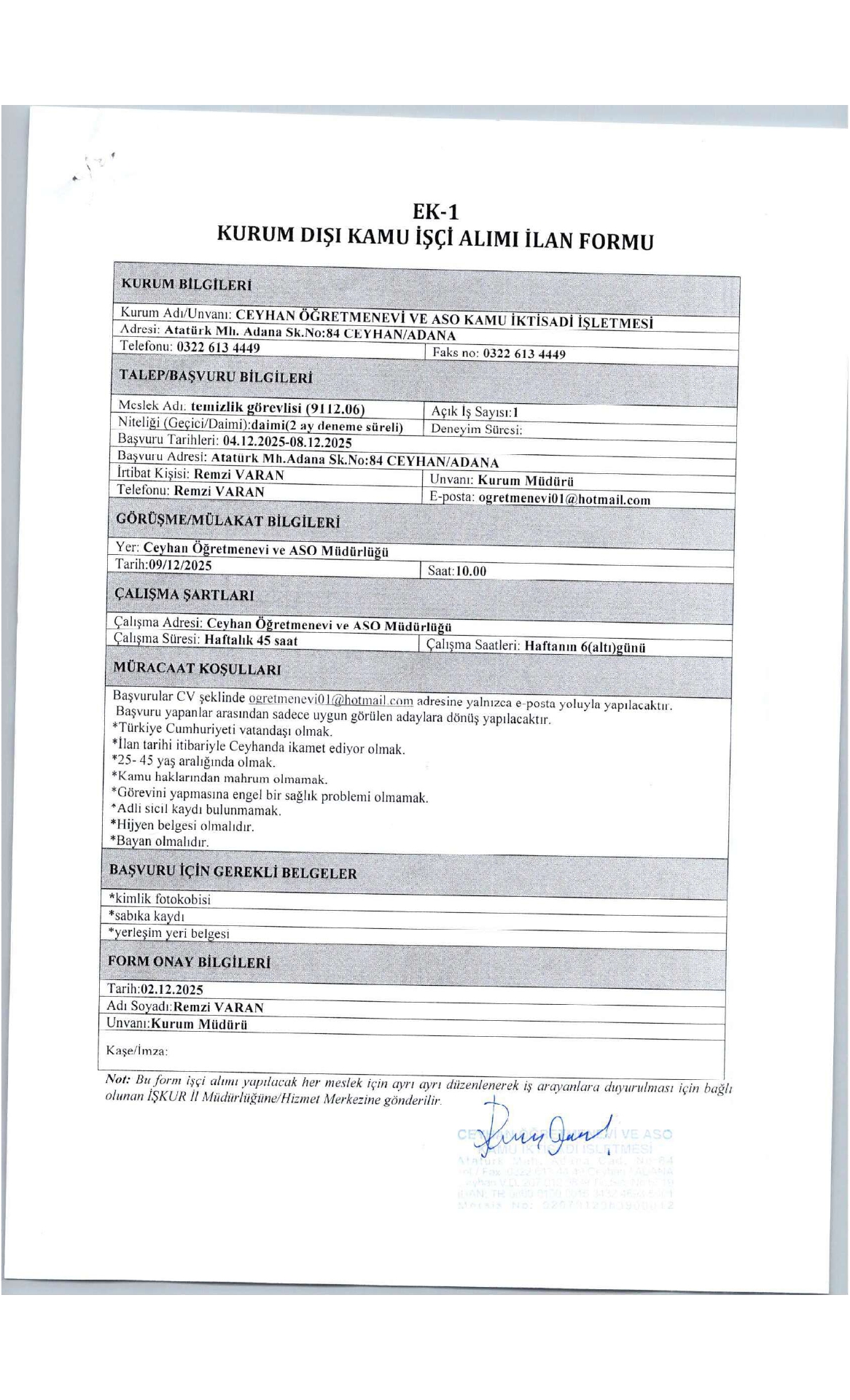 Ana sayfaDaimi İşçi İlanları Adana Ceyhan Öğretmenevi 1 İşçi Alacak Adana Ceyhan Öğretmenevi 1 İşçi Alacak. Son başvuru tarihi 8 Aralık 2025 Kaynak : İşkur İlan Giriş : 03 Aralık 2025 22:40, Son Güncelleme : 03 Aralık 2025 22:59 Yazdır Yorumlar (0) Abone Ol