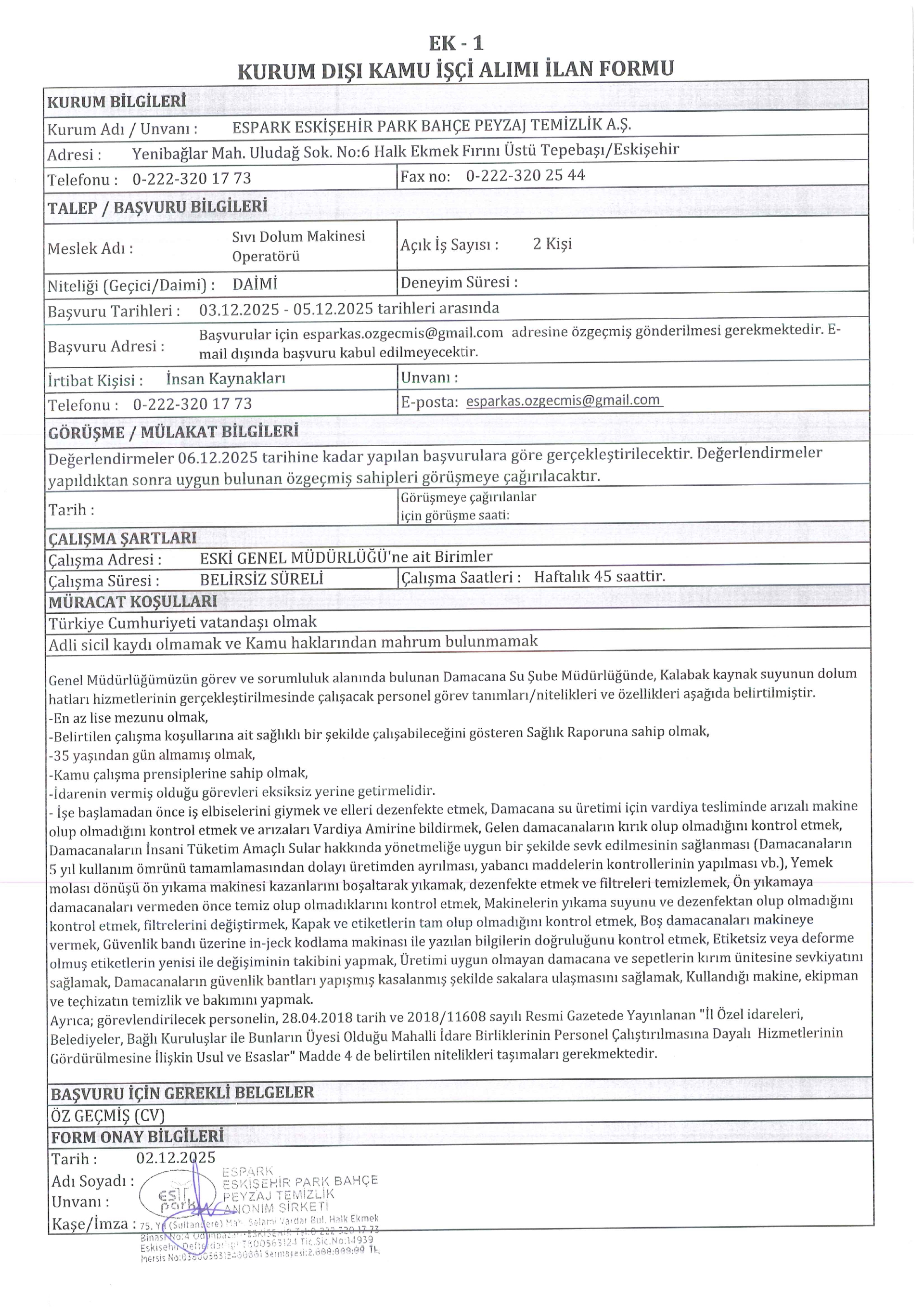 Eskişehir Espark 2 İşçi Alacak. Son başvuru tarihi 5 Aralık 2025