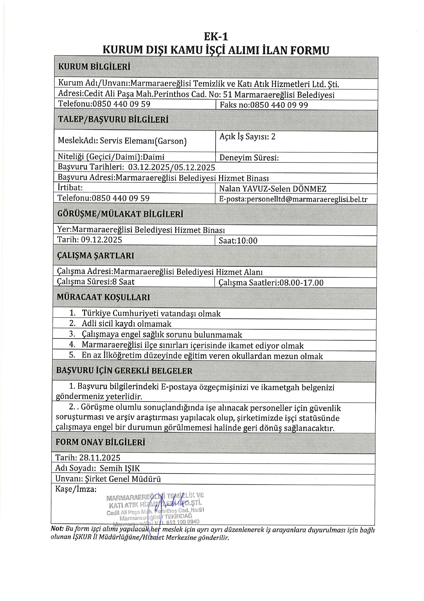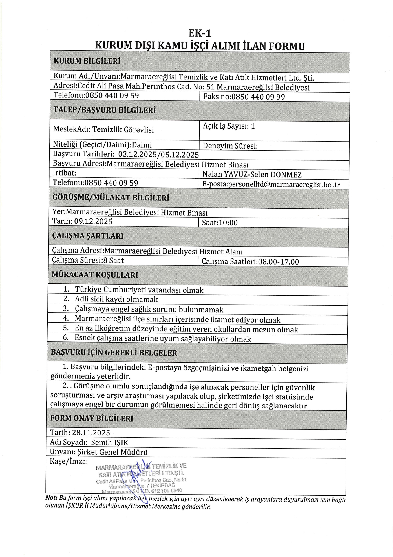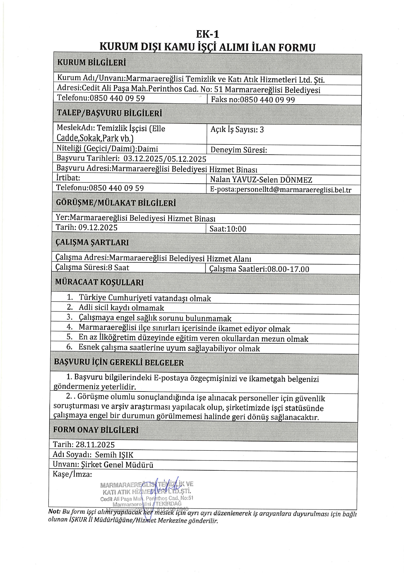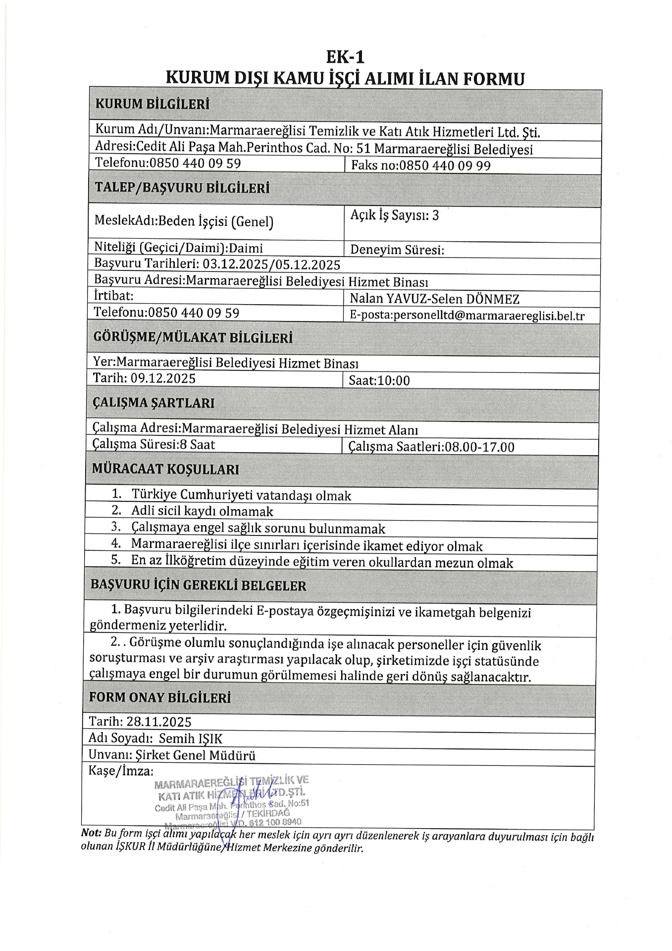 Ana sayfaDaimi İşçi İlanları Tekirdağ Marmaraereğlisi Temizlik 18 İşçi Alacak Tekirdağ Marmaraereğlisi Temizlik 18 İşçi Alacak. Son başvuru tarihi 5 Aralık 2025 Kaynak : İşkur İlan Giriş : 03 Aralık 2025 22:52, Son Güncelleme : 03 Aralık 2025 23:00 Yazdır Yorumlar (0) Abone Ol
