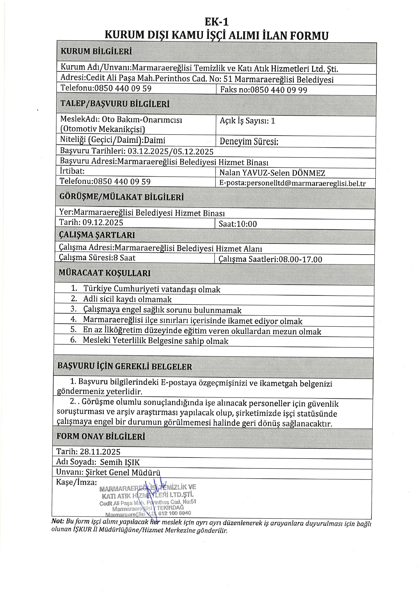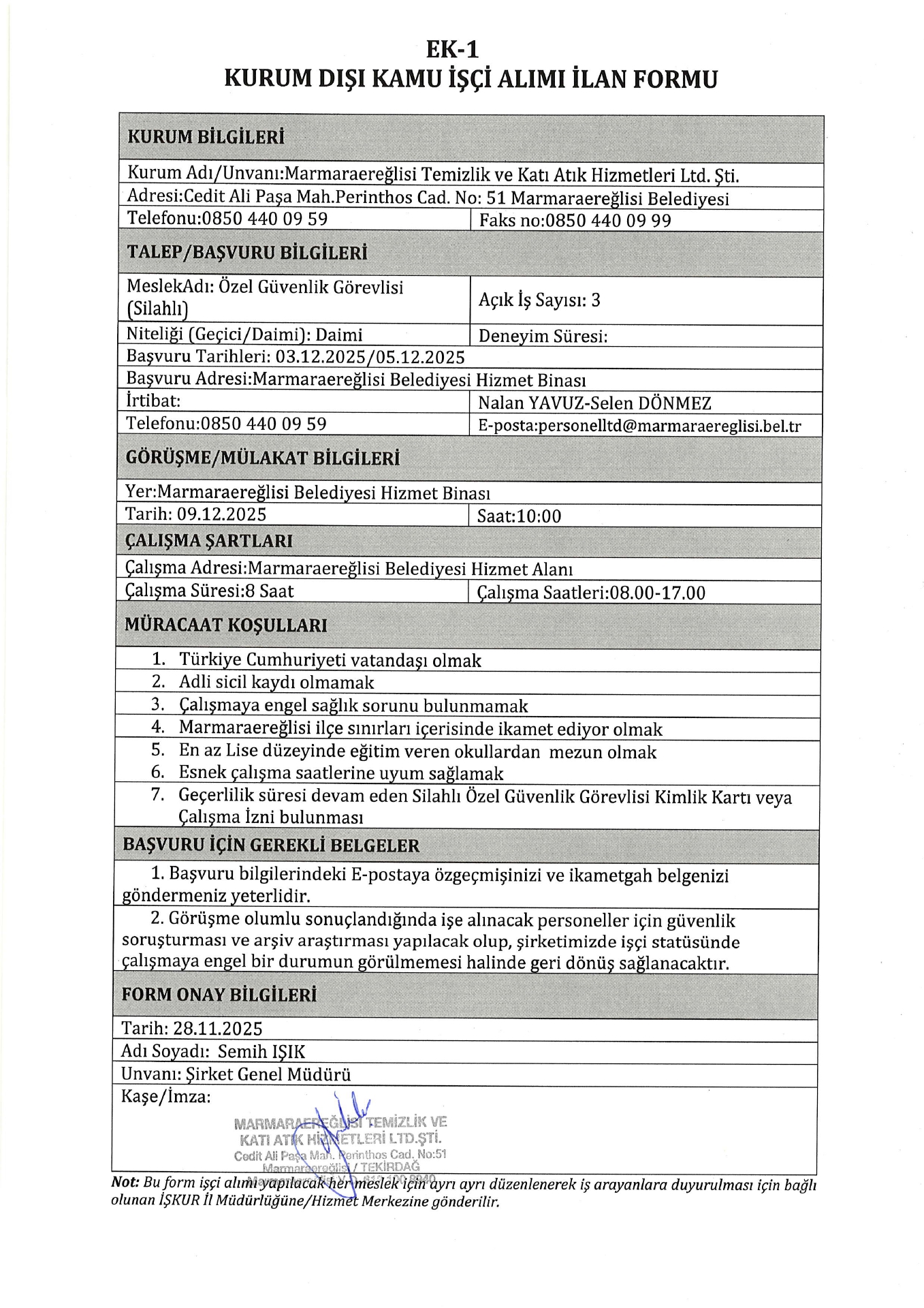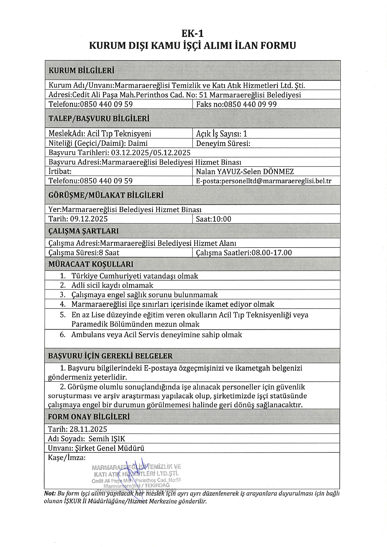 Ana sayfaDaimi İşçi İlanları Tekirdağ Marmaraereğlisi Temizlik 18 İşçi Alacak Tekirdağ Marmaraereğlisi Temizlik 18 İşçi Alacak. Son başvuru tarihi 5 Aralık 2025 Kaynak : İşkur İlan Giriş : 03 Aralık 2025 22:52, Son Güncelleme : 03 Aralık 2025 23:00 Yazdır Yorumlar (0) Abone Ol
