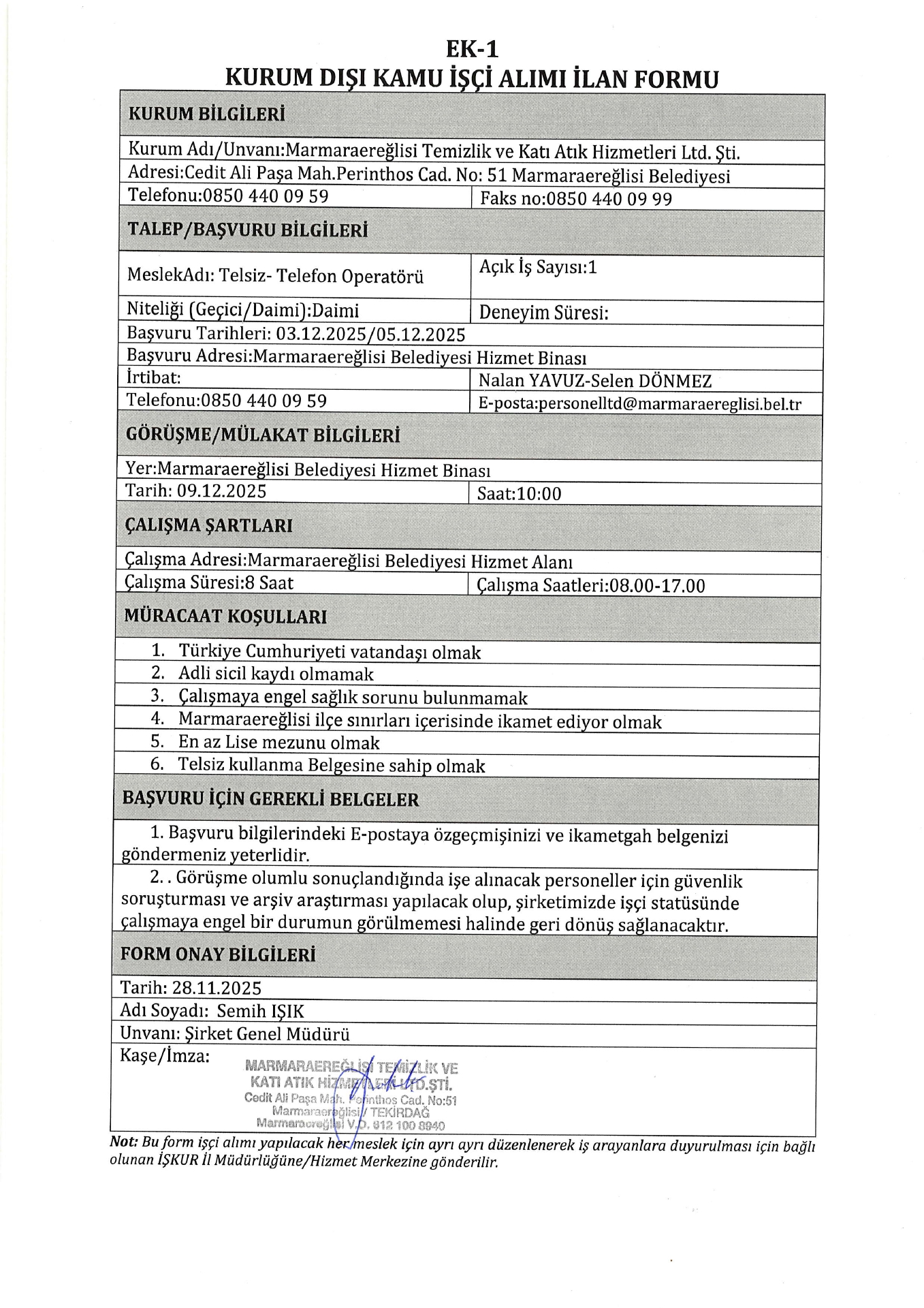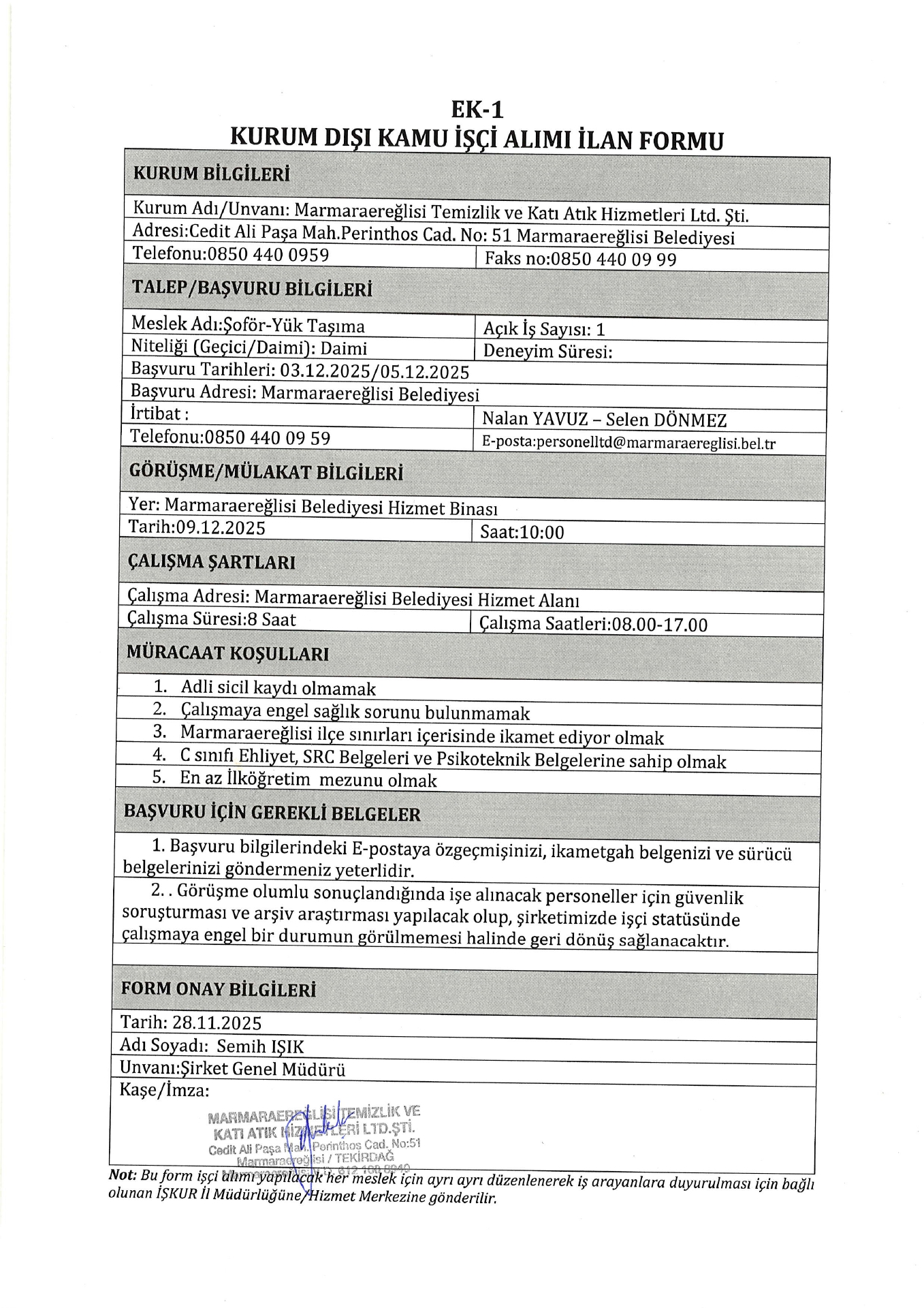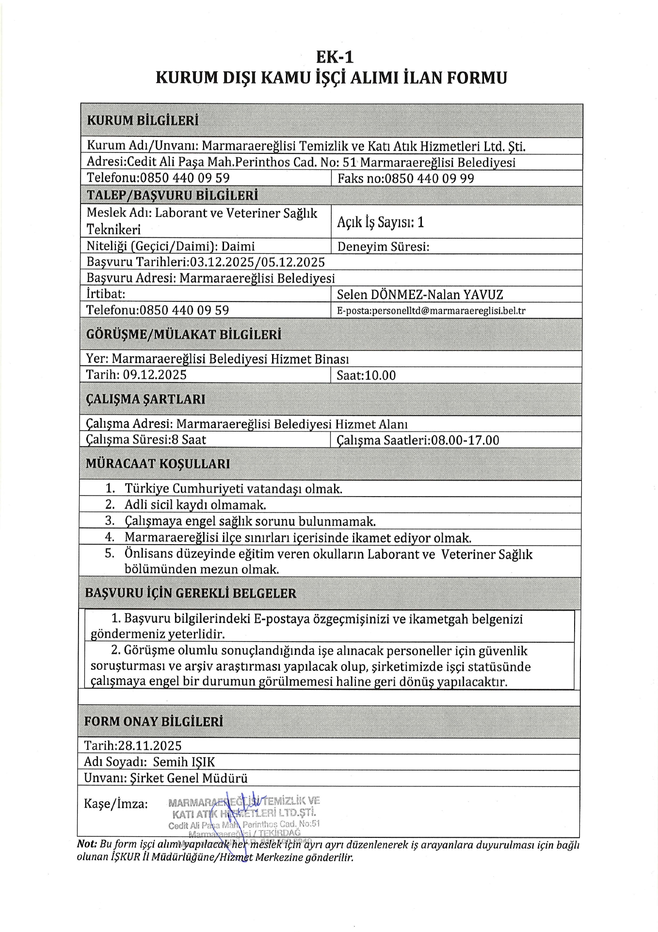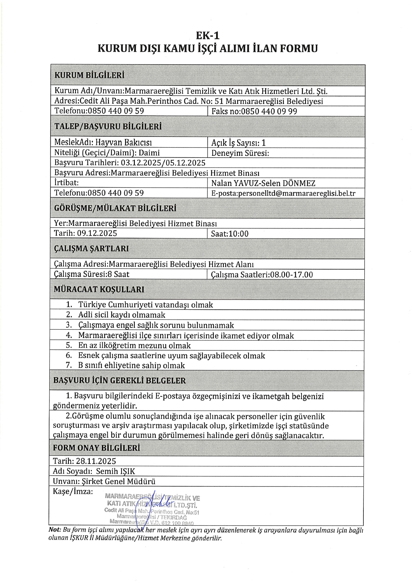 Ana sayfaDaimi İşçi İlanları Tekirdağ Marmaraereğlisi Temizlik 18 İşçi Alacak Tekirdağ Marmaraereğlisi Temizlik 18 İşçi Alacak. Son başvuru tarihi 5 Aralık 2025 Kaynak : İşkur İlan Giriş : 03 Aralık 2025 22:52, Son Güncelleme : 03 Aralık 2025 23:00 Yazdır Yorumlar (0) Abone Ol