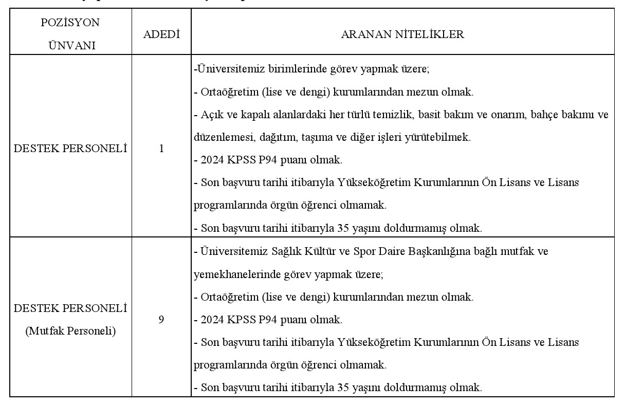 Üniversitemize bağlı birimlerde çalıştırılmak ve giderleri Özel Bütçeden karşılanmak üzere 657 Sayılı Devlet Memurları Kanununun 4 üncü maddesinin (B) fıkrasına göre istihdam edilmek üzere 06/06/1978 tarihli 7/15754 sayılı Bakanlar Kurulu kararına ekli 28.06.2007 tarih ve 26566 Sayılı Resmi Gazete'de yayımlanan "Sözleşmeli Personel Çalıştırılmasına İlişkin Esaslarda Değişiklik Yapılmasına Dair Esaslar" da yer alan ek 2 inci maddenin (b) fıkrasına göre aşağıda belirtilen pozisyonlarda, 2024 KPSS (B) grubu puan sıralaması esas alınmak suretiyle, yazılı veya sözlü sınav yapılmaksızın sözleşmeli personel alınacaktır.