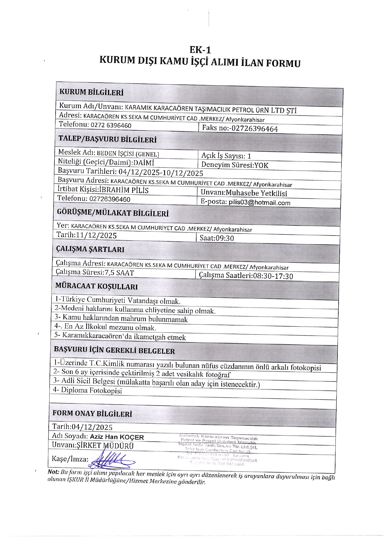 Afyonkarahisar Karamık Karacaören Taşımacılık 1 İşçi Alacak. Son başvuru tarihi 10 Aralık 2025