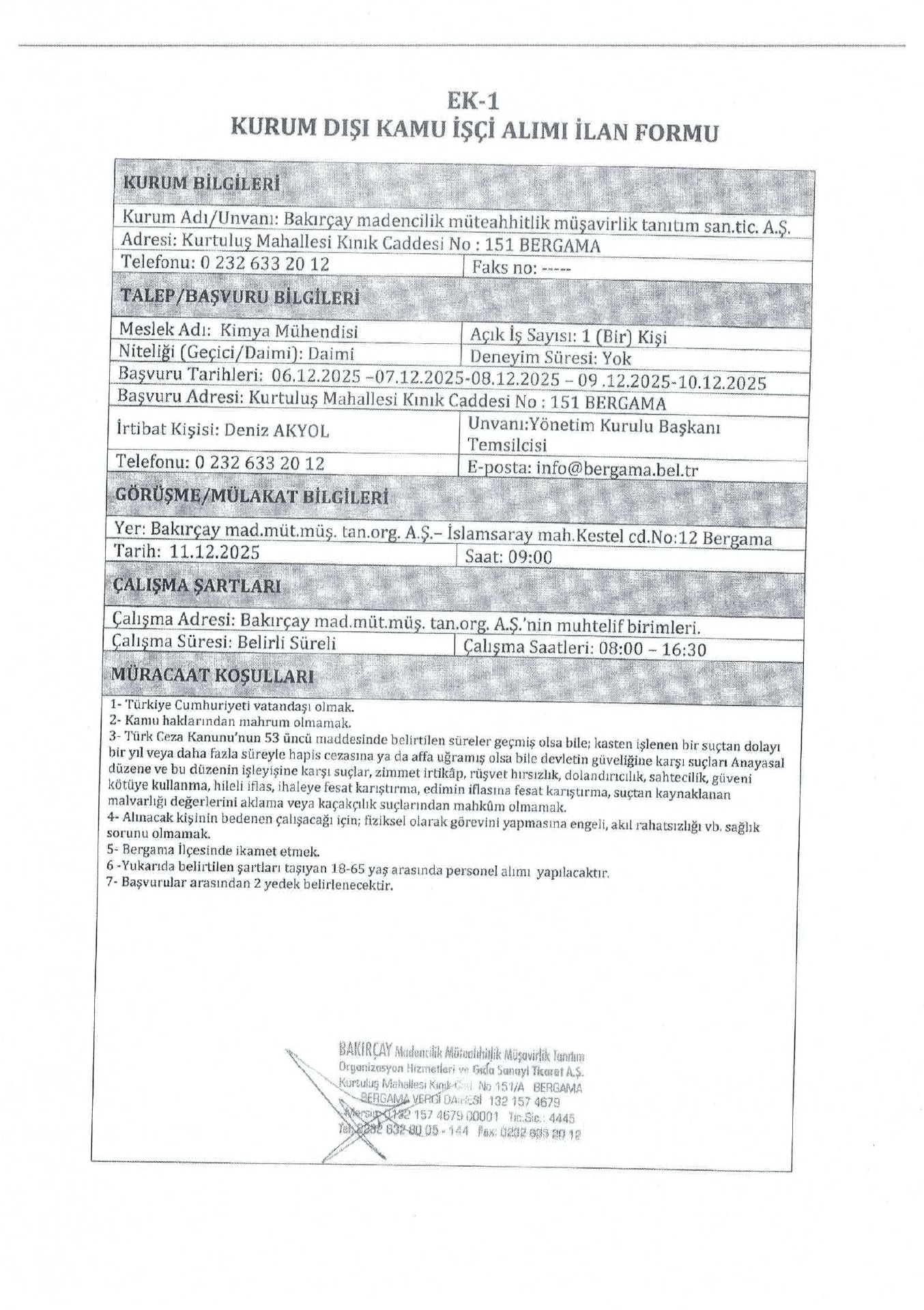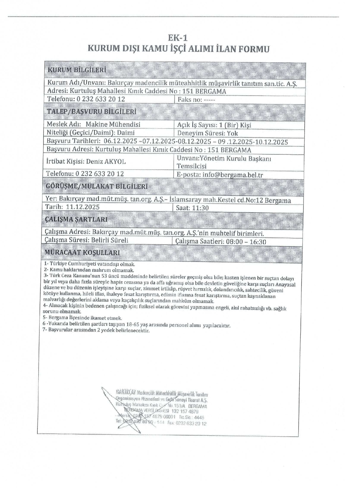 Ana sayfaDaimi İşçi İlanları İzmir Bakırçay Madencilik 2 İşçi Alacak İzmir Bakırçay Madencilik 2 İşçi Alacak. Son başvuru tarihi 7 Aralık 2025 Kaynak : İşkur İlan Giriş : 04 Aralık 2025 23:09, Son Güncelleme : 04 Aralık 2025 23:52 Yazdır Yorumlar (0) Abone Ol