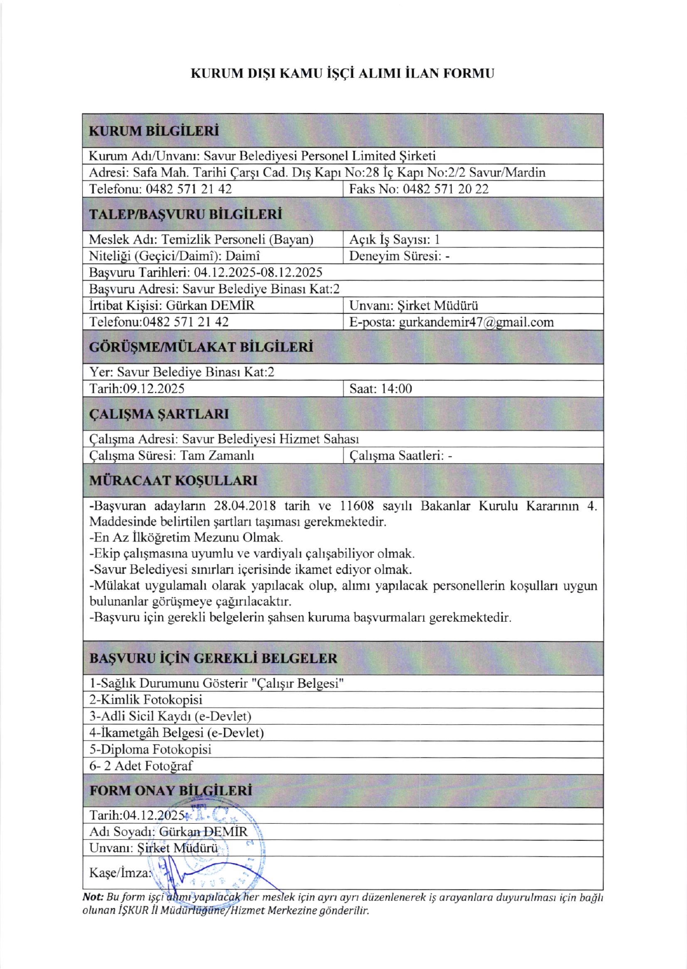 Ana sayfaDaimi İşçi İlanları Mardin Savur Belediyesi 1 İşçi Alacak Mardin Savur Belediyesi 1 İşçi Alacak. Son başvuru tarihi 8 Aralık 2025 Kaynak : İşkur İlan Giriş : 04 Aralık 2025 23:18, Son Güncelleme : 04 Aralık 2025 23:50 Yazdır Yorumlar (0) Abone Ol