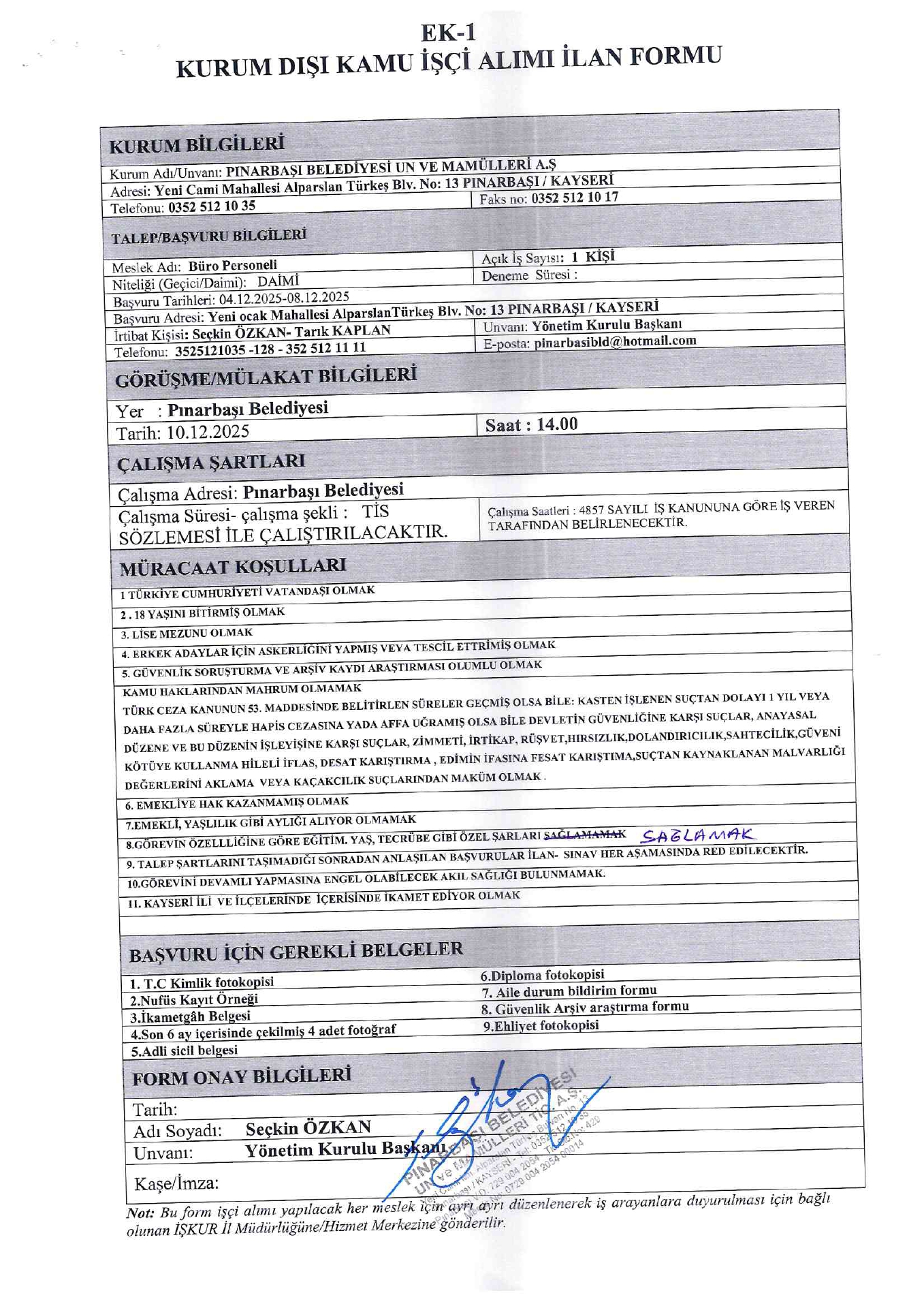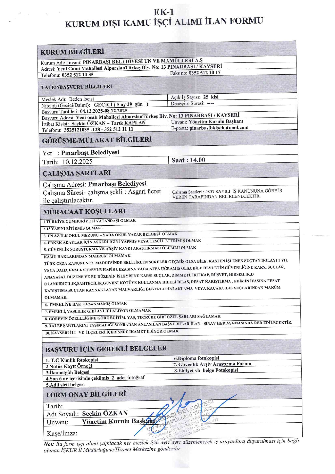 Ana sayfaDaimi İşçi İlanları Kayseri Pınarbaşı Belediyesi 26 İşçi Alacak Kayseri Pınarbaşı Belediyesi 26 İşçi Alacak. Son başvuru tarihi 8 Aralık 2025 Kaynak : İşkur İlan Giriş : 04 Aralık 2025 23:27, Son Güncelleme : 04 Aralık 2025 23:47 Yazdır Yorumlar (0) Abone Ol