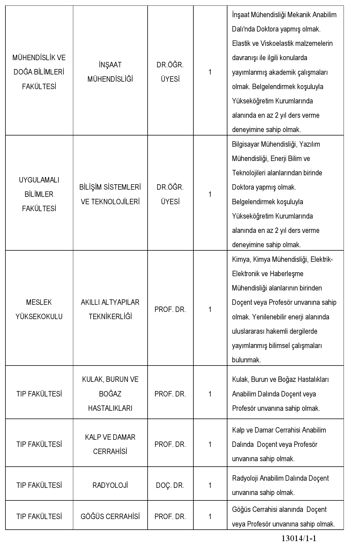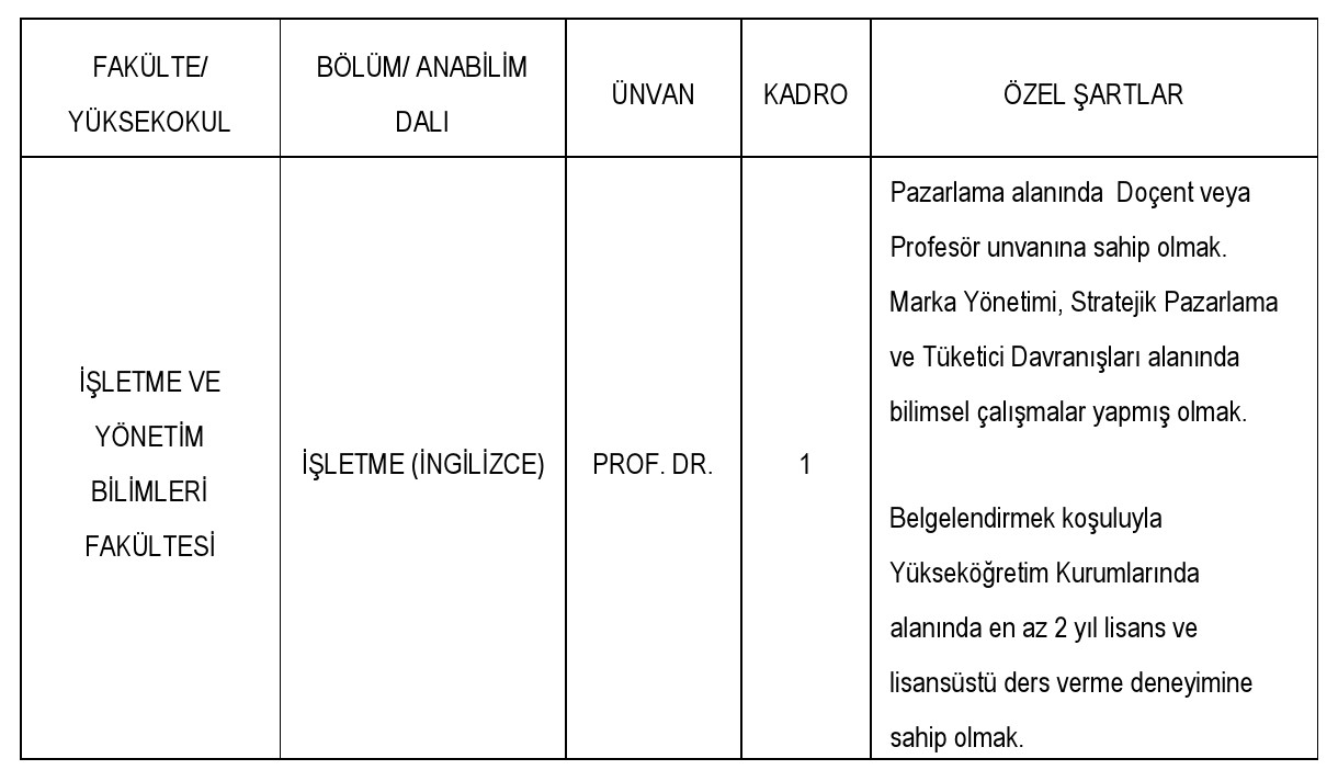 Üniversitemize 2547 sayılı Yükseköğretim Kanunu ve 12.06.2018 tarih ve 30449 sayılı Resmi Gazete'de yayımlanarak yürürlüğe giren "Öğretim Üyeliği Yükseltilme ve Atanma Yönetmeliği'nin" ilgili maddeleri uyarınca aşağıda nitelikleri belirtilen kadrolara Öğretim Üyeleri alınacaktır.