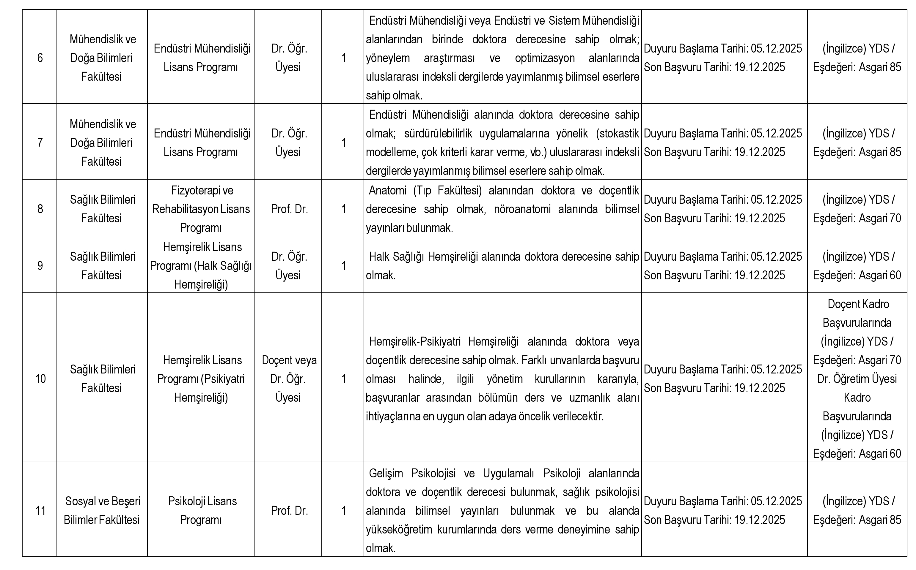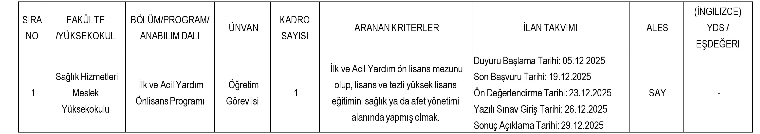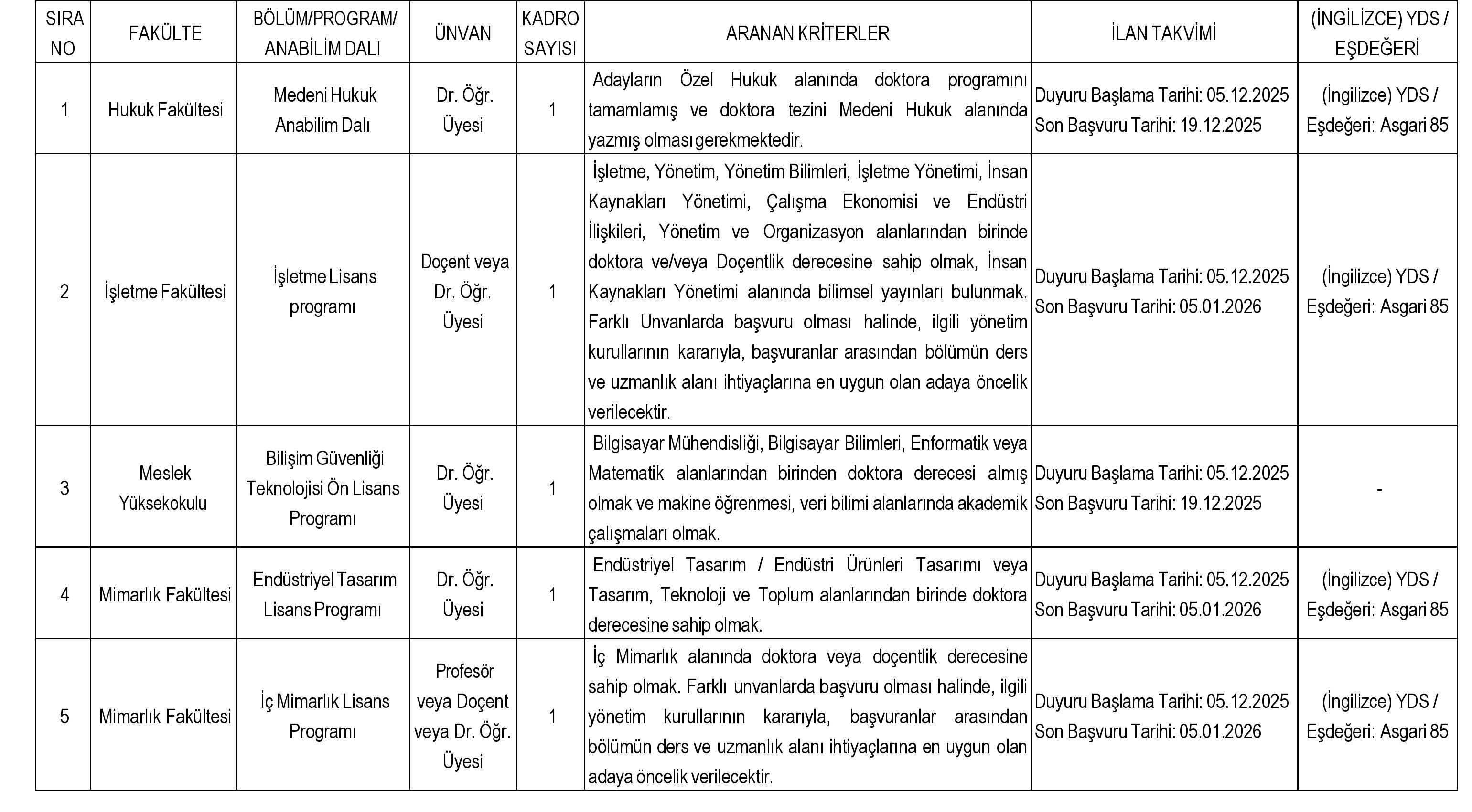 -Yabancı Dil (İngilizce) Sınav Belgesi; tablodaki puan dikkate alınmalıdır. Yabancı dil puanı belirtilmeyen kadrolar için belge istenmemektedir.
