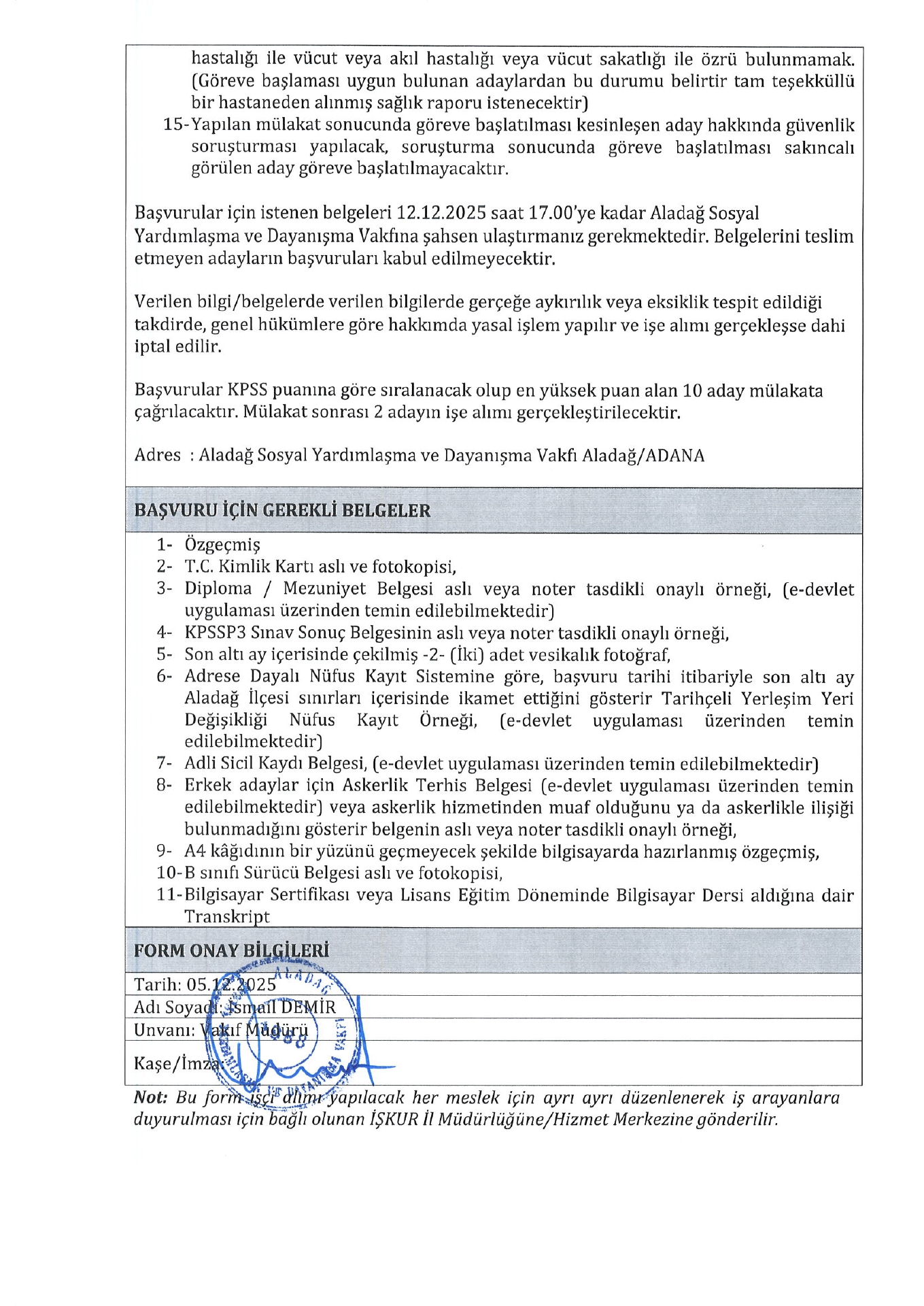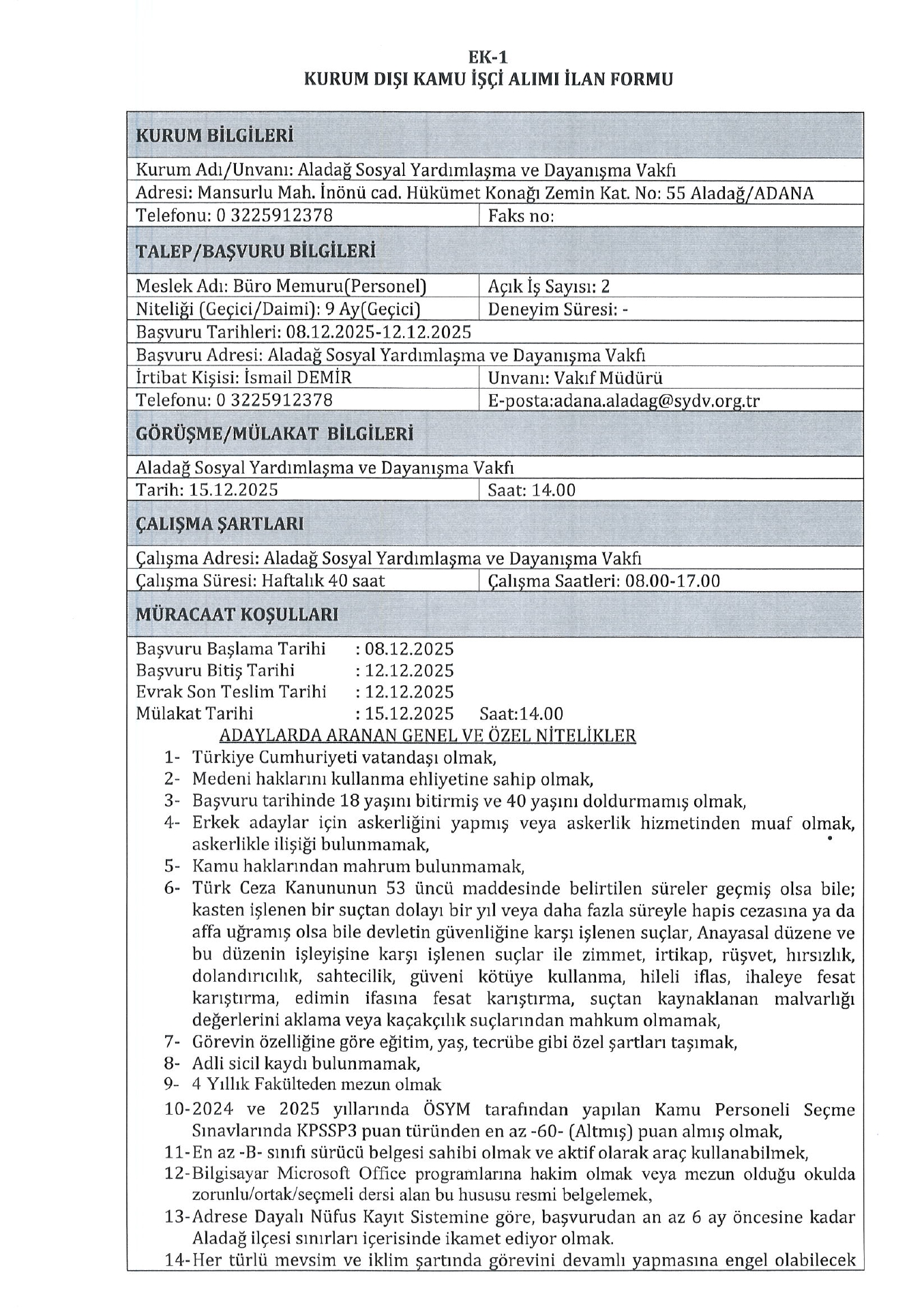 Ana sayfaSYDV İlanlarıAna sayfaGeçici İşçi İlanları Adana Aladağ SYDV Geçici 2 İşçi Alacak Adana Aladağ SYDV Geçici 2 İşçi Alacak. Son başvuru tarihi 12 Aralık 2025 Kaynak : İşkur İlan Giriş : 05 Aralık 2025 22:43, Son Güncelleme : 05 Aralık 2025 23:35 Yazdır Yorumlar (0) Abone Ol