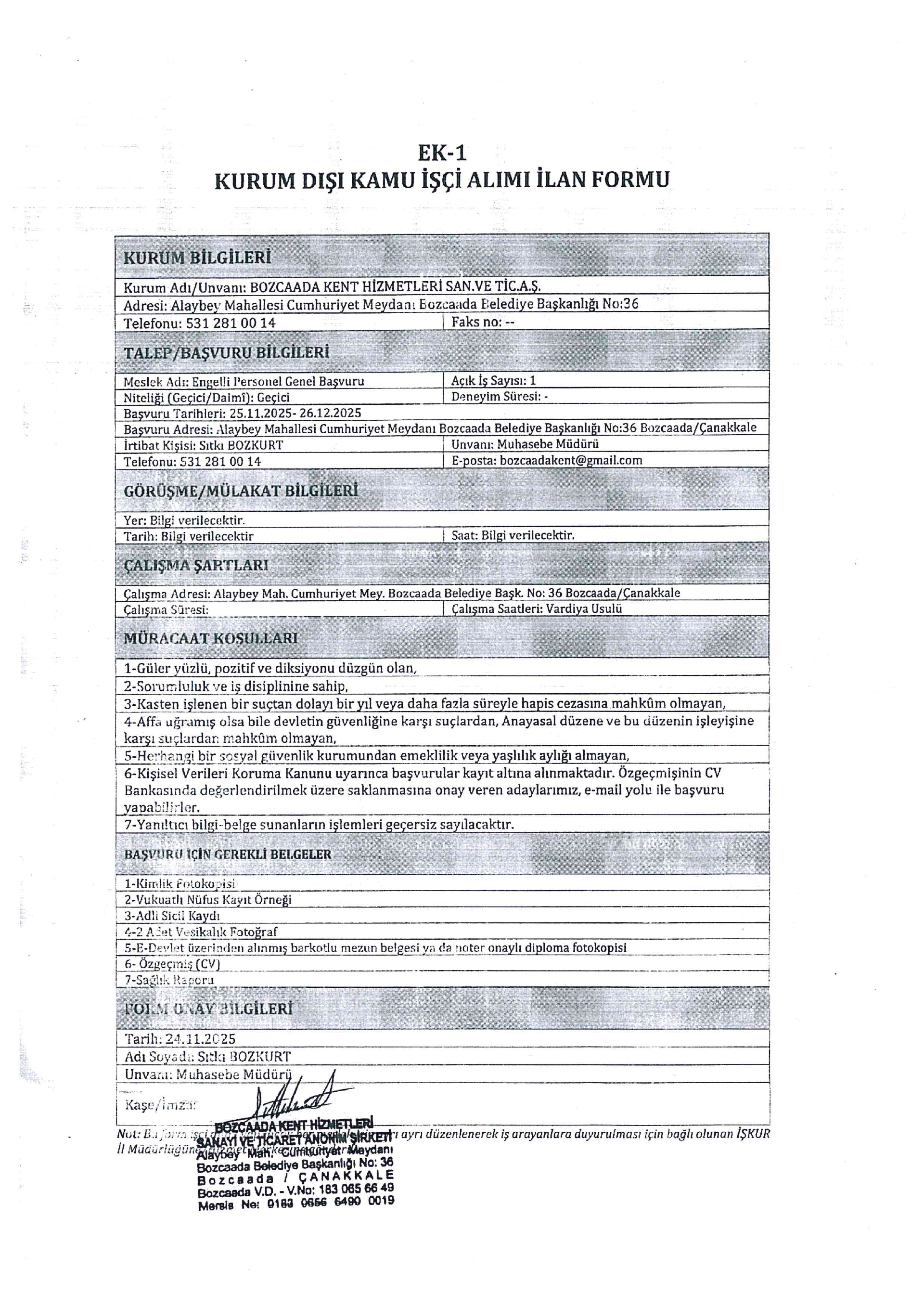 Çanakkale Bozcaada Kent Hizmetleri Geçici 1 İşçi Alacak. Son başvuru tarihi 26 Aralık 2025
