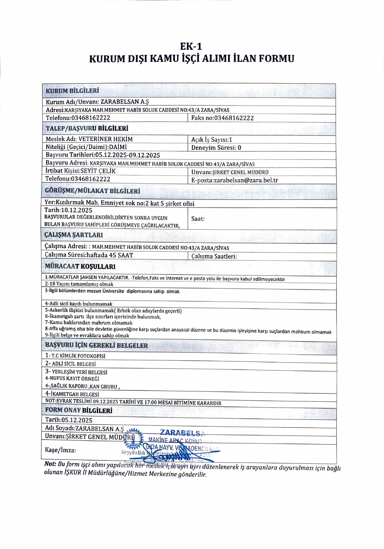 Ana sayfaDaimi İşçi İlanları Sivas Zara Belediyesi 1 İşçi Alacak Sivas Zara Belediyesi 1 İşçi Alacak. Son başvuru tarihi 9 Aralık 2025 Kaynak : İşkur İlan Giriş : 05 Aralık 2025 23:22, Son Güncelleme : 05 Aralık 2025 23:23 Yazdır Yorumlar (0) Abone Ol