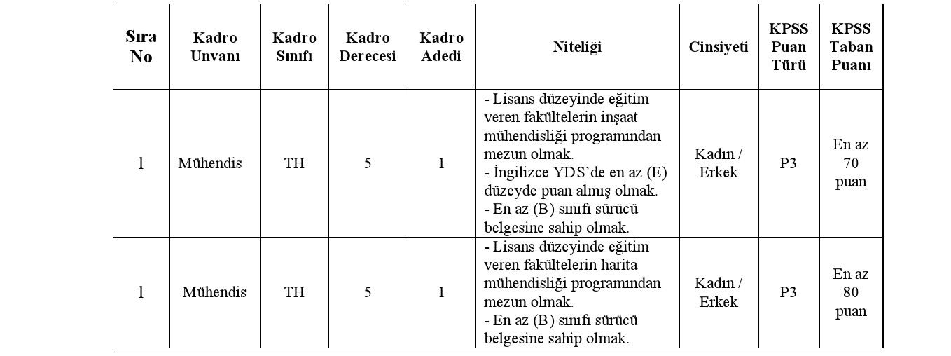 Konya ili Meram Belediye Başkanlığı bünyesinde 5393 sayılı Belediye Kanununun 49 uncu maddesi ile Mahalli İdarelere İlk Defa Atanacaklara Dair Sınav ve Atama Yönetmeliği hükümlerine göre aşağıda unvanı, sınıfı, derecesi, adedi, nitelikleri, KPSS puan türü, KPSS taban puanı ve diğer şartları taşımak kaydıyla, belirtilen boş pozisyonlara tam zamanlı sözleşmeli personel alınacaktır.