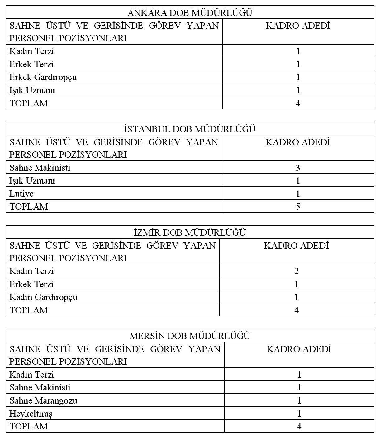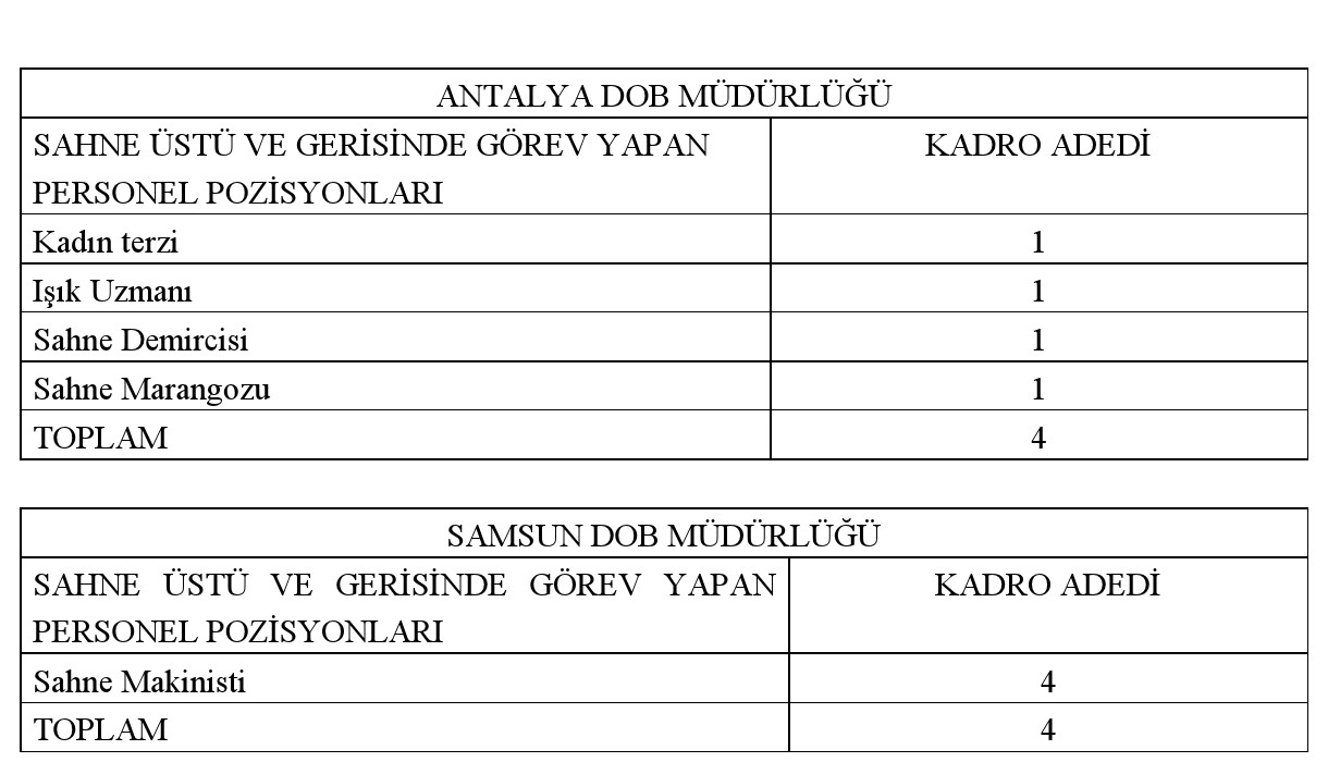 Devlet Opera ve Balesi Genel Müdürlüğüne bağlı Ankara, İstanbul, İzmir, Mersin, Antalya ve Samsun Devlet Opera ve Balesi Müdürlüklerinde, 657 sayılı Devlet Memurları Kanunu'nun 4 üncü maddesinin B fıkrası uyarınca 6/6/1978 tarih ve 7/15754 sayılı Bakanlar Kurulu Kararı ile yürürlüğe konulan Sözleşmeli Personel Çalıştırılmasına İlişkin Esasların ek 8 inci maddesi kapsamında ve esaslara ekli 5 sayılı cetvelinde yer alan sahne üstü ve sahne gerisi grubunda görev yapmak üzere aşağıda belirtilen branş ve sayıda sözleşmeli personel alınacaktır.
