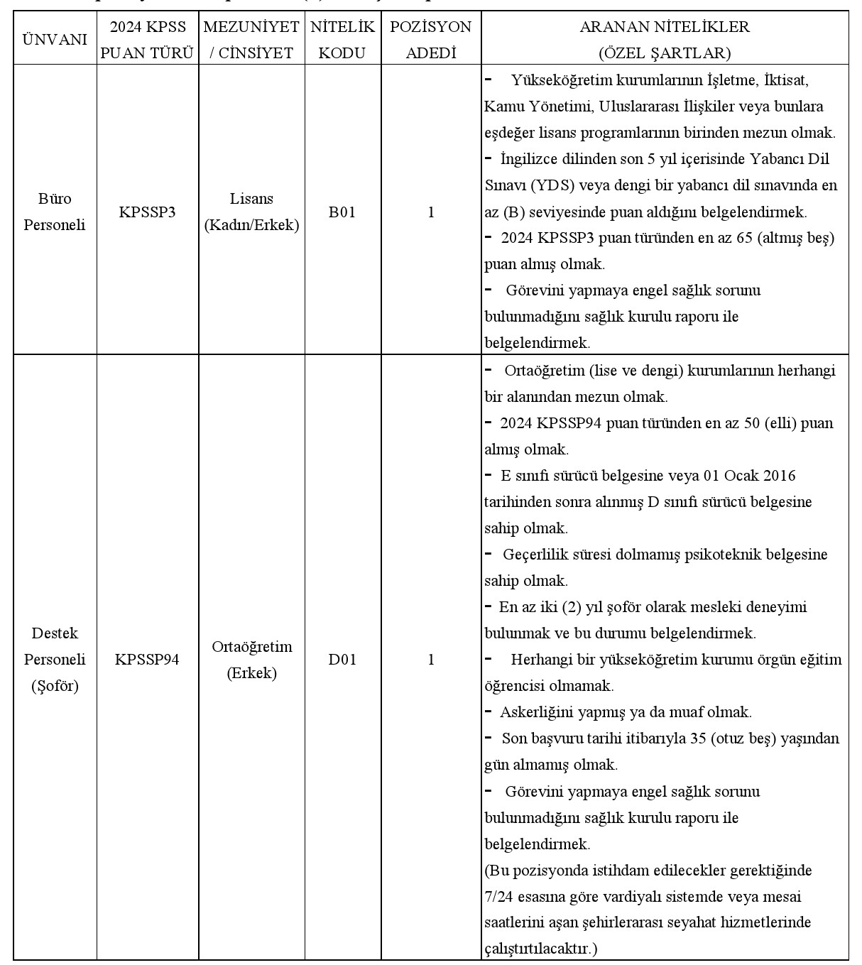 - Destek Personeli (şoför) pozisyonuna müracaat eden adayların ayrıca; psikoteknik belgesi ile şoför olarak deneyim şartını sağladıklarını kanıtlayacak SGK dökümüyle uyumlu çalıştıkları kurumdan alacakları bir belgeyi "belgeler" alanındaki ilgili alana mutlaka yüklemeleri gerekmektedir.
