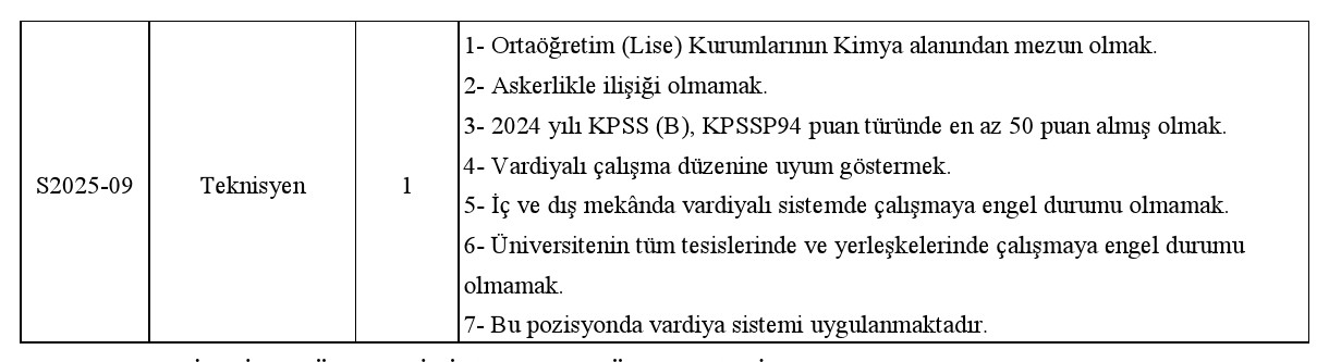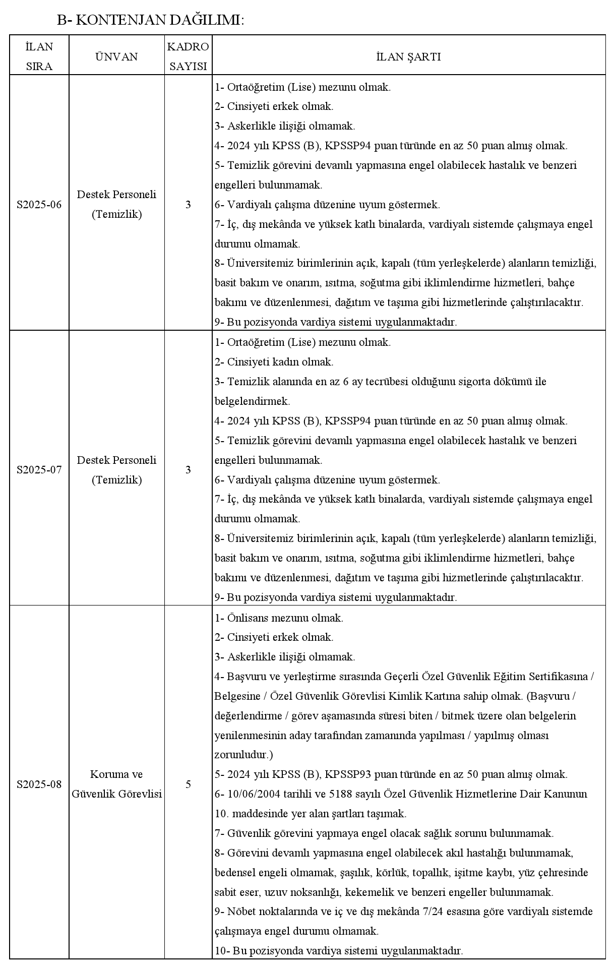 Üniversitemiz birimlerinde 657 sayılı Devlet Memurları Kanunu'nun 4. maddesinin (B) fıkrasına göre istihdam edilmek üzere, 06.06.1978 tarihli ve 7/15754 sayılı Bakanlar Kurulu Kararı ile yürürlüğe konulan "Sözleşmeli Personel Çalıştırılmasına İlişkin Esaslar"da yer alan ek 2'inci maddenin (b) fıkrası gereğince "Yazılı ve/veya sözlü sınav yapılmaksızın, KPSS (B) grubu puan sıralaması esas alınmak suretiyle" sözleşmeli personel alınacaktır.