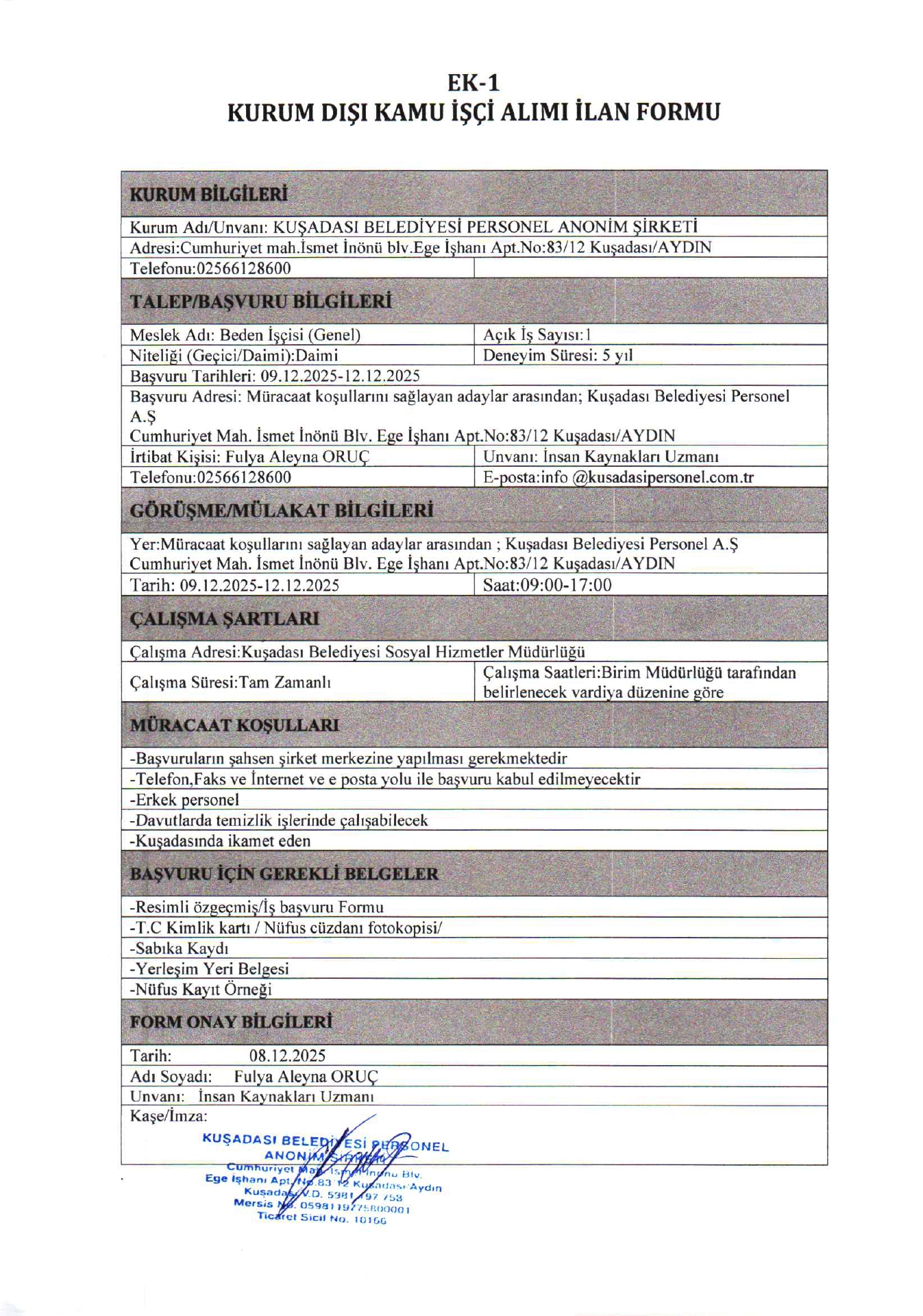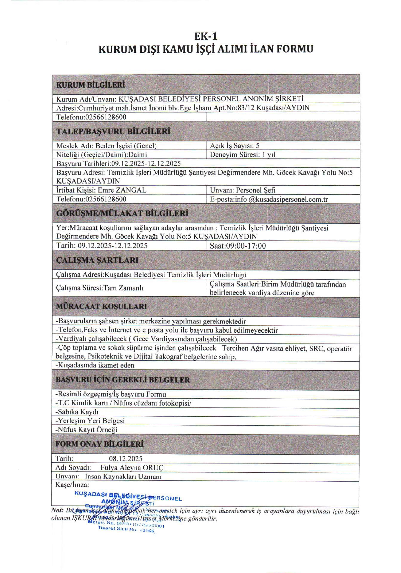 Ana sayfaDaimi İşçi İlanları Aydın Kuşadası Belediyesi 6 İşçi Alacak Aydın Kuşadası Belediyesi 6 İşçi Alacak. Son başvuru tarihi 14 Aralık 2025 Kaynak : İşkur İlan Giriş : 08 Aralık 2025 22:38, Son Güncelleme : 08 Aralık 2025 23:30 Yazdır Yorumlar (0) Abone Ol