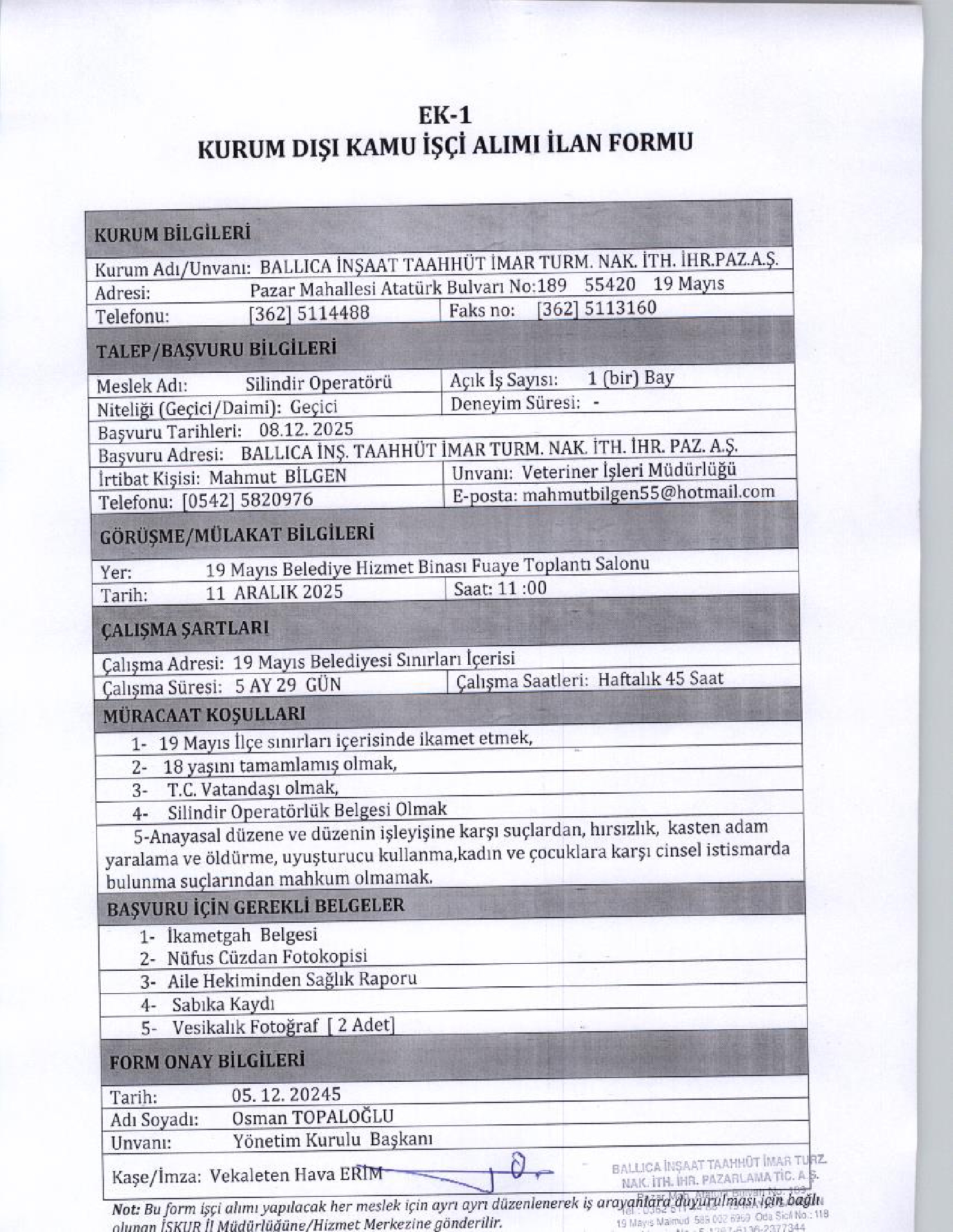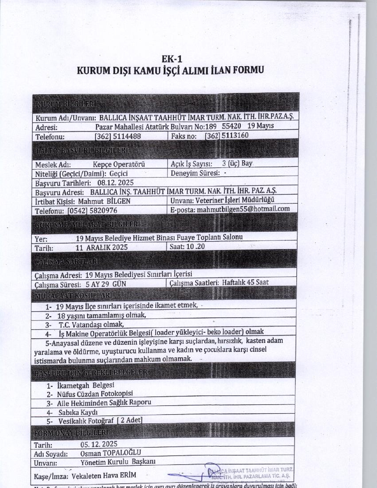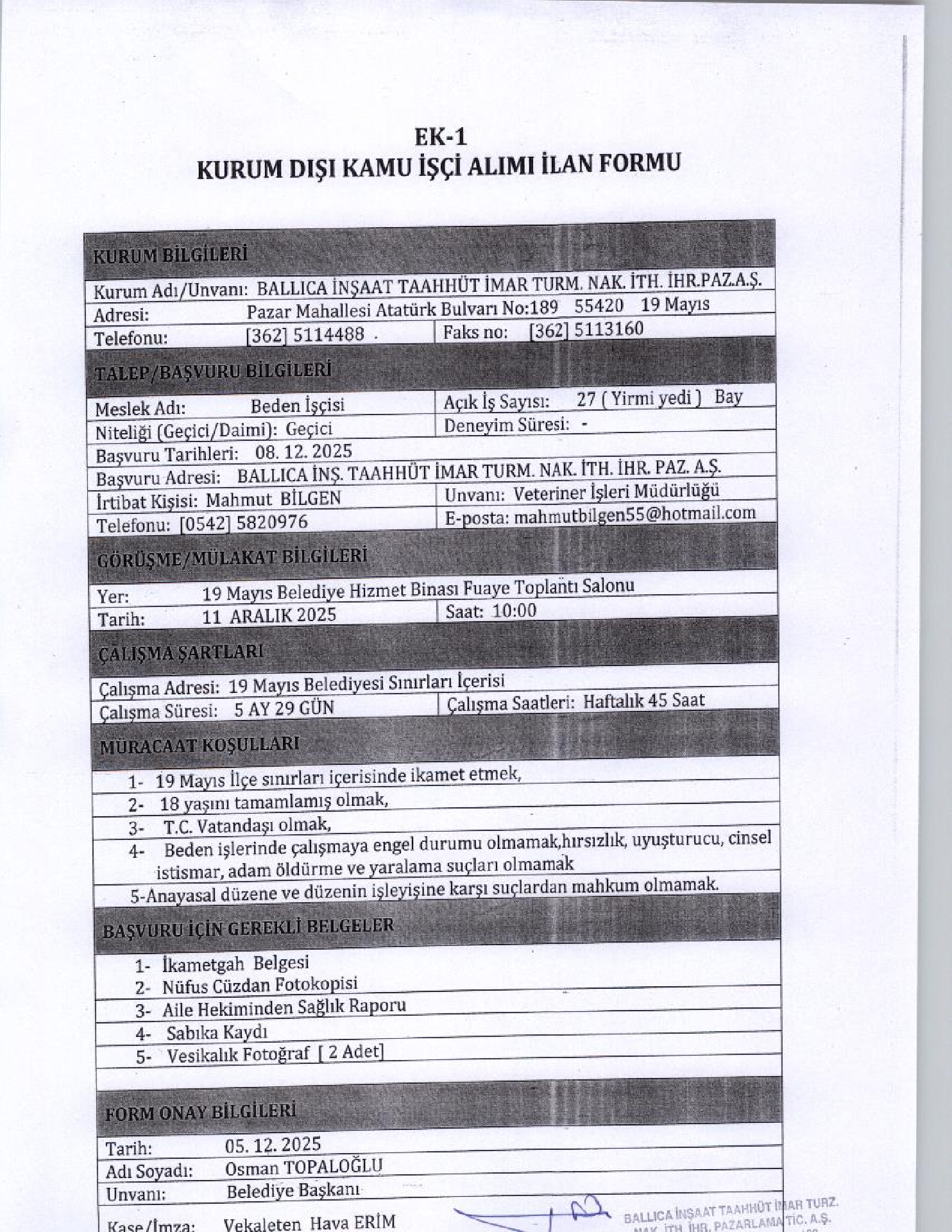 Ana sayfaGeçici İşçi İlanları Ballıca İnşaat Geçici 31 İşçi Alacak Ballıca İnşaat Geçici 31 İşçi Alacak. Son başvuru tarihi 11 Aralık 2025 Kaynak : İşkur İlan Giriş : 08 Aralık 2025 22:42, Son Güncelleme : 08 Aralık 2025 23:29 Yazdır Yorumlar (0) Abone Ol