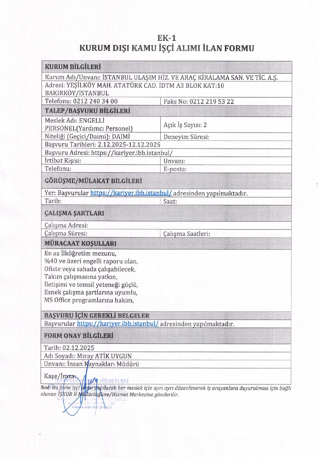 Ana sayfaDaimi İşçi İlanları İstanbul Ulaşım 2 İşçi Alacak İstanbul Ulaşım 2 İşçi Alacak. Son başvuru tarihi 12 Aralık 2025 Kaynak : İşkur İlan Giriş : 08 Aralık 2025 22:52, Son Güncelleme : 08 Aralık 2025 23:26 Yazdır Yorumlar (0) Abone Ol