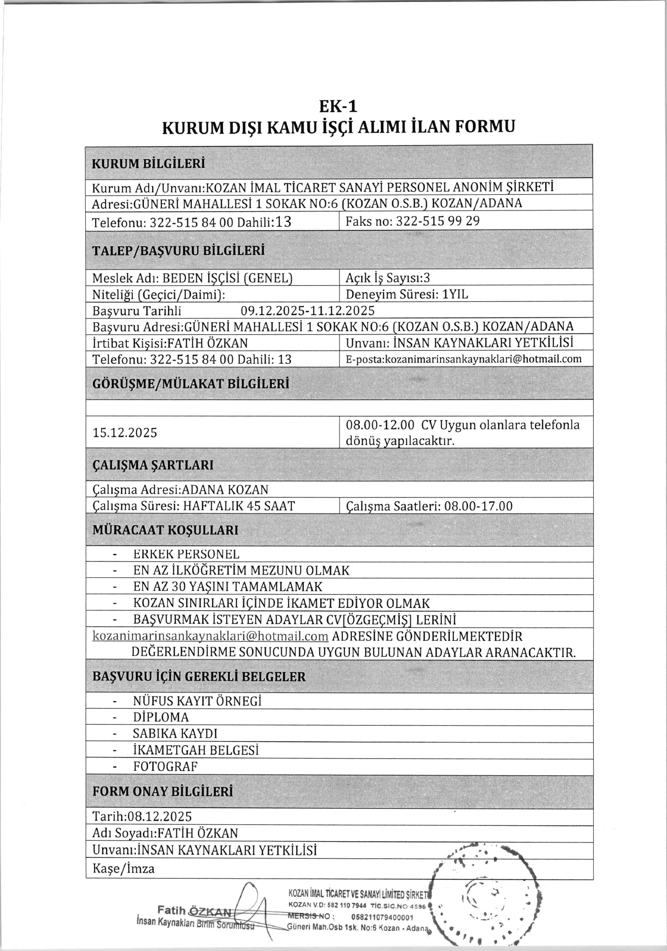 Adana Kozan İmal 3 İşçi Alacak