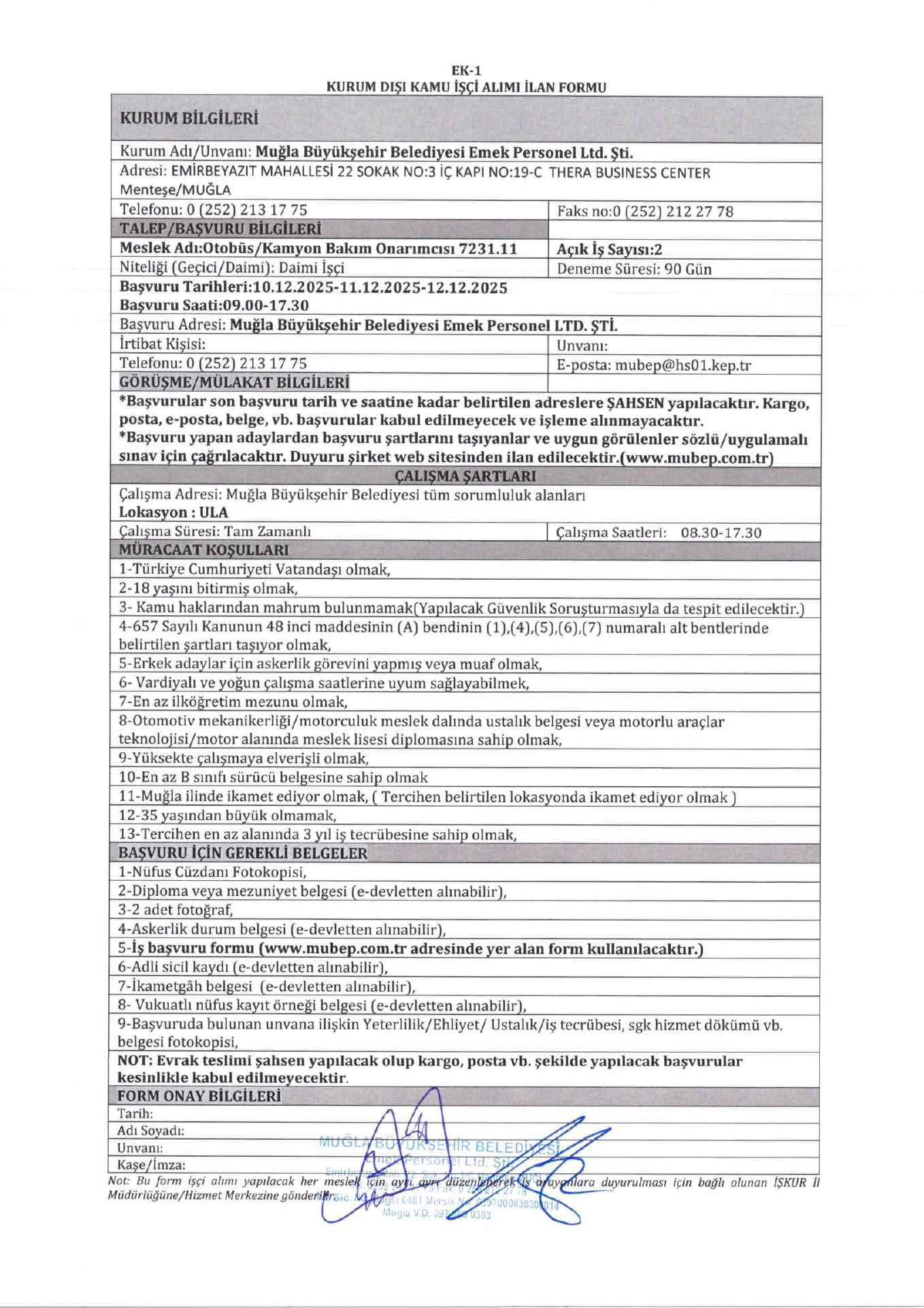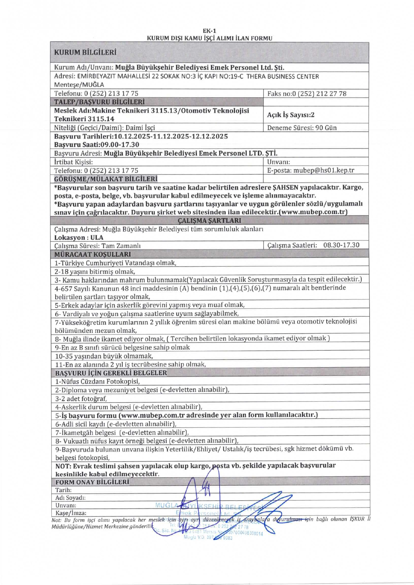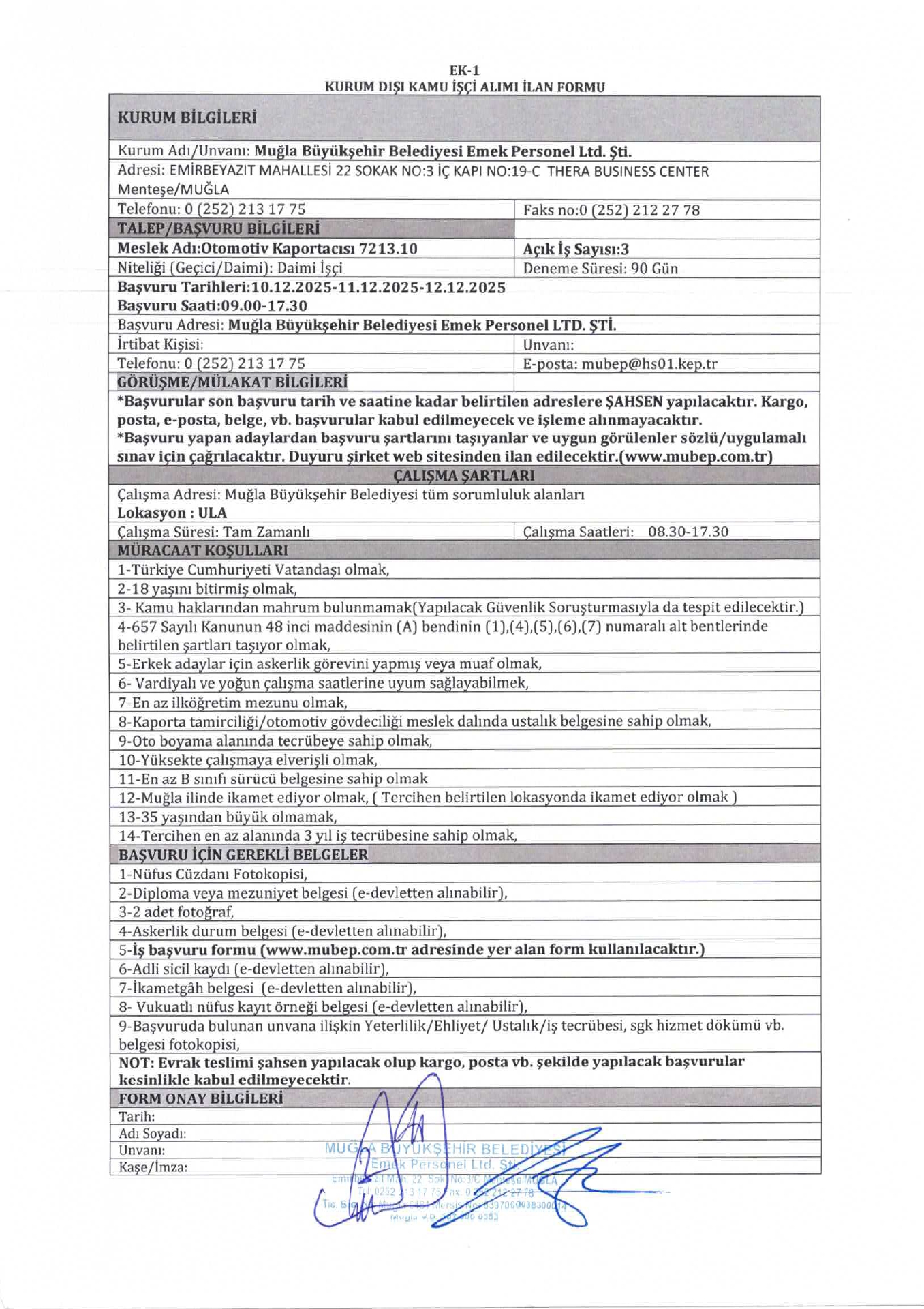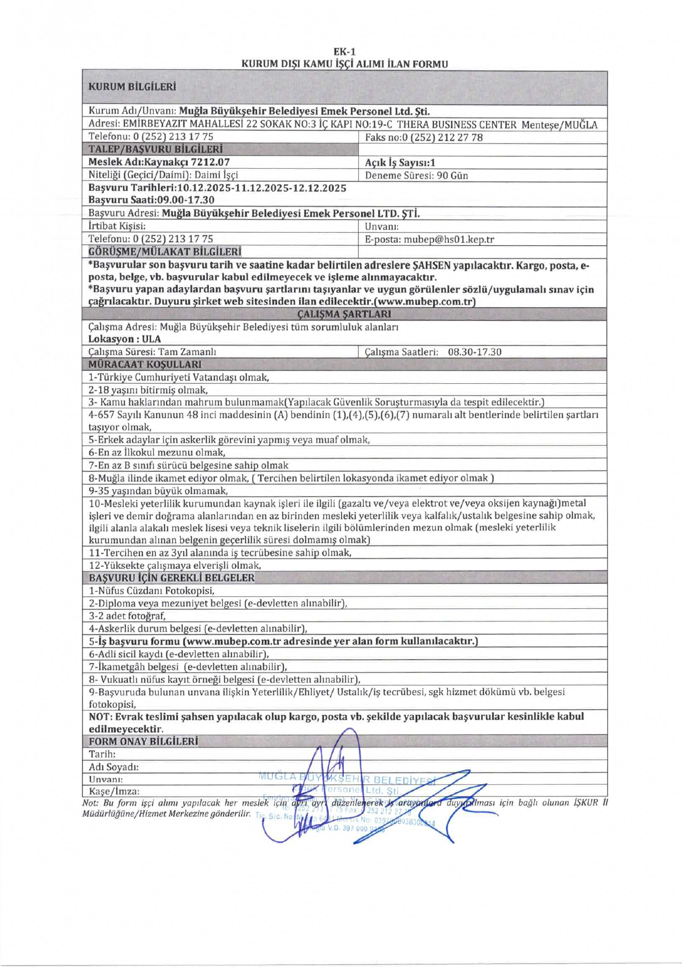 Müğla Büyükşehir Belediyesi 8 İşçi Alacak. Son başvuru tarihi 12 Aralık 2025