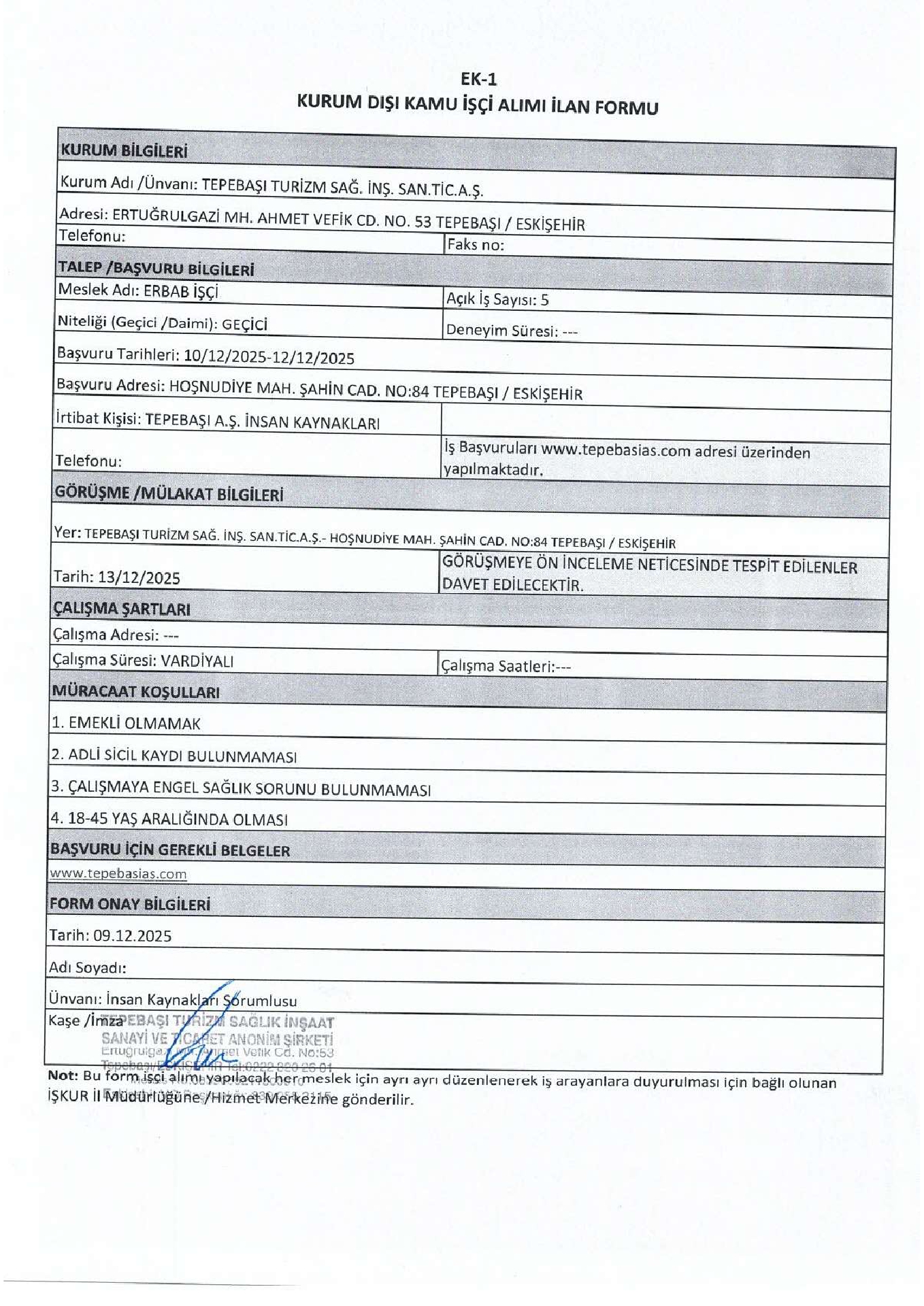 Ana sayfaGeçici İşçi İlanları Eskişehir Tepebaşı Turizm Geçici 5 İşçi Alacak Eskişehir Tepebaşı Turizm Geçici 5 İşçi Alacak. Son başvuru tarihi 12 Aralık 2025 Kaynak : İşkur İlan Giriş : 10 Aralık 2025 00:05, Son Güncelleme : 09 Aralık 2025 23:44 Yazdır Yorumlar (0) Abone Ol
