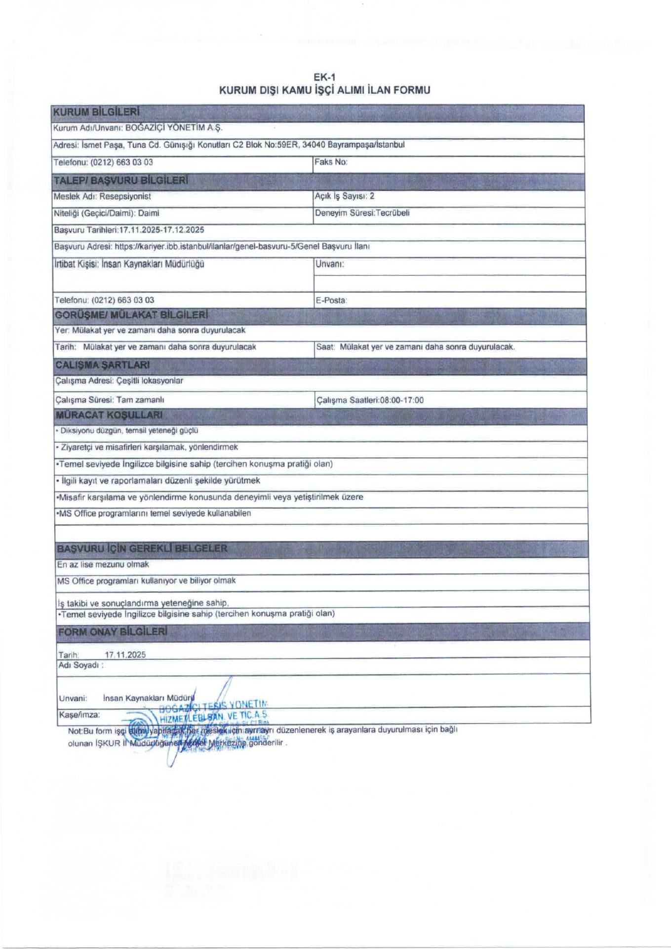 Ana sayfaDaimi İşçi İlanları İstanbul Boğaziçi Yönetim 2 İşçi Alacak İstanbul Boğaziçi Yönetim 2 İşçi Alacak. Son başvuru tarihi 17 Aralık 2025 Kaynak : İşkur İlan Giriş : 10 Aralık 2025 00:11, Son Güncelleme : 09 Aralık 2025 23:43 Yazdır Yorumlar (0) Abone Ol