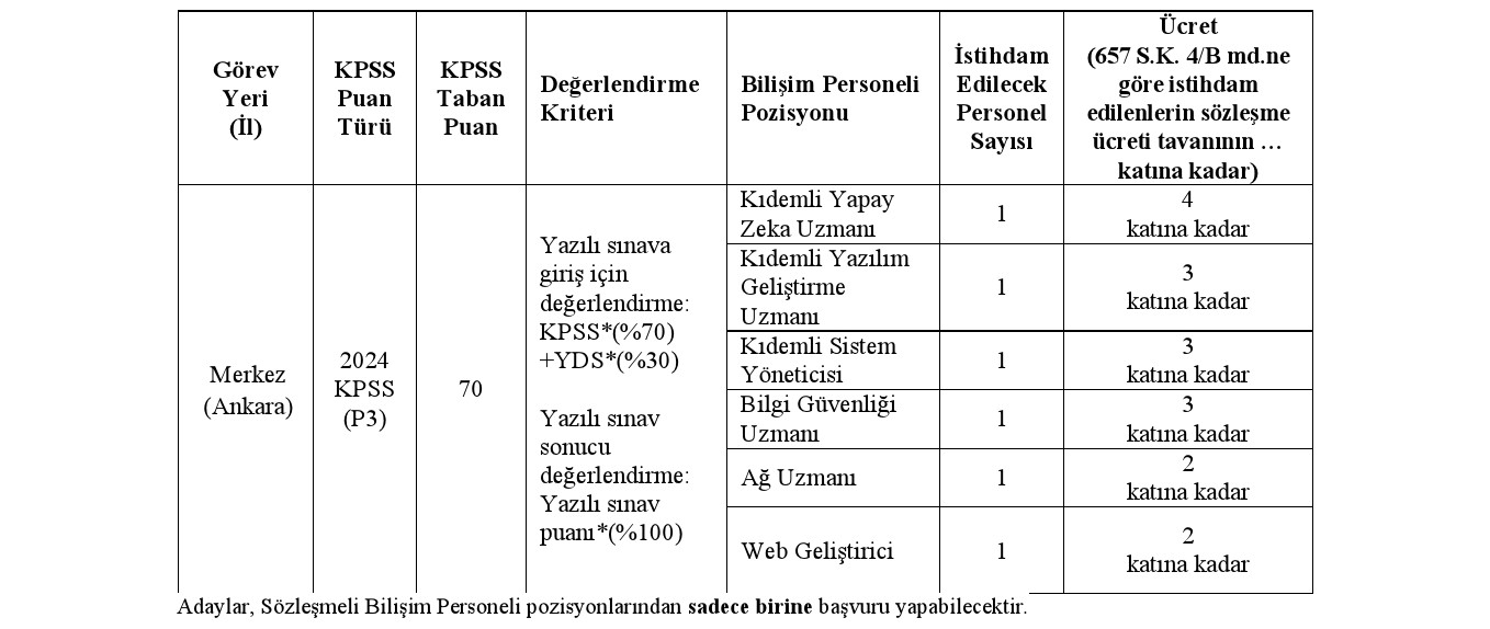 Adaylar, Sözleşmeli Bilişim Personeli pozisyonlarından sadece birine başvuru yapabilecektir.
