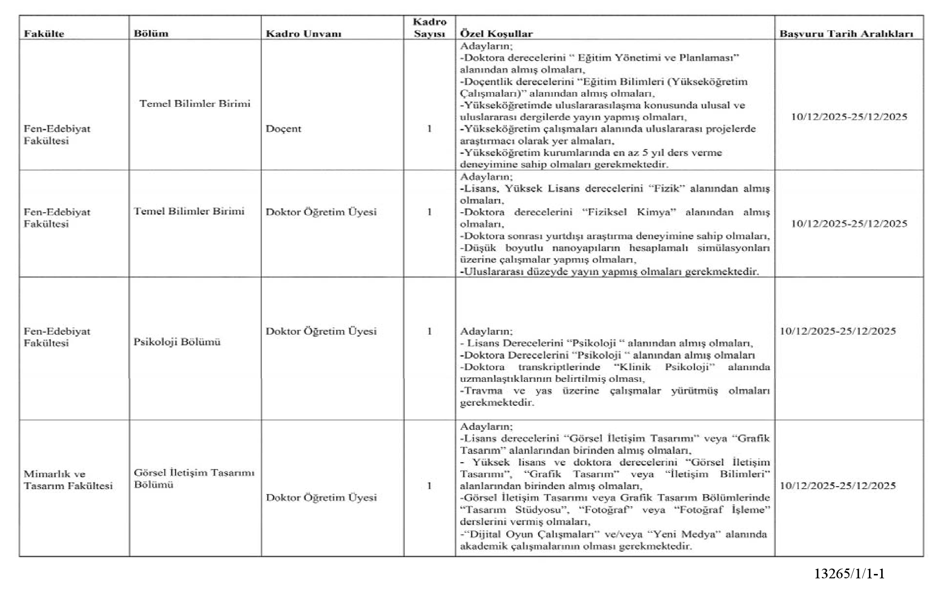 Rektörlüğe hitaben yazılacak olan, başvuracağı fakülte ve bölümü belirtir, kişinin iletişim bilgilerini içeren bir dilekçenin ekinde; bir adet vesikalık fotoğraf ile nüfus cüzdanı fotokopilerini, öğrenim durumlarını gösterir tüm belgelerini (Lisans/YXisans/Doktora), doçentlik belgelerini, askerliğini tamamlamış olduğunu gösterir belgelerini, fotoğraflı özgeçmişlerini (yayınlarını, hazırlanmakla veya yayınlanmak üzere süreci başlatılmış olan yayınlarını, öğretilen dersler ve yönettiği / yönelmeye devam etliği doktora / yüksek lisans çalışmalarının listesini, yayınlarına yapılan atıfları ve yayın kurulu üyeliği, yarışma ve ödü! Jürisi üyeliği vb... diğer faaliyetlerini içeren), referans verebilecekleri üç kişinin iletişim bilgileriyle isimlerini, yabancı dil belgelerini, eğilim felsefelerini ve akademik ajandalarını (Öğrenim ve Araştırma Planlarını) içeren niyet mektuplarını, öğrenme sürecinde öğrencinin aktifliğini ve öğrenmeyi sahiplenmesini sağlamak için kullanılan strateji ve yöntemleri içeren portfolyolarmı, bu yaklaşımın uygulandığını gösteren kanıtları iletmeleri gerekmektedir, ilan edilen unvan için yabancı ülkelerden alınan diplomaların Üniversitelerarası Kurulca denkliğinin onaylanmış olması ve belgelendirilmesi şarttır.