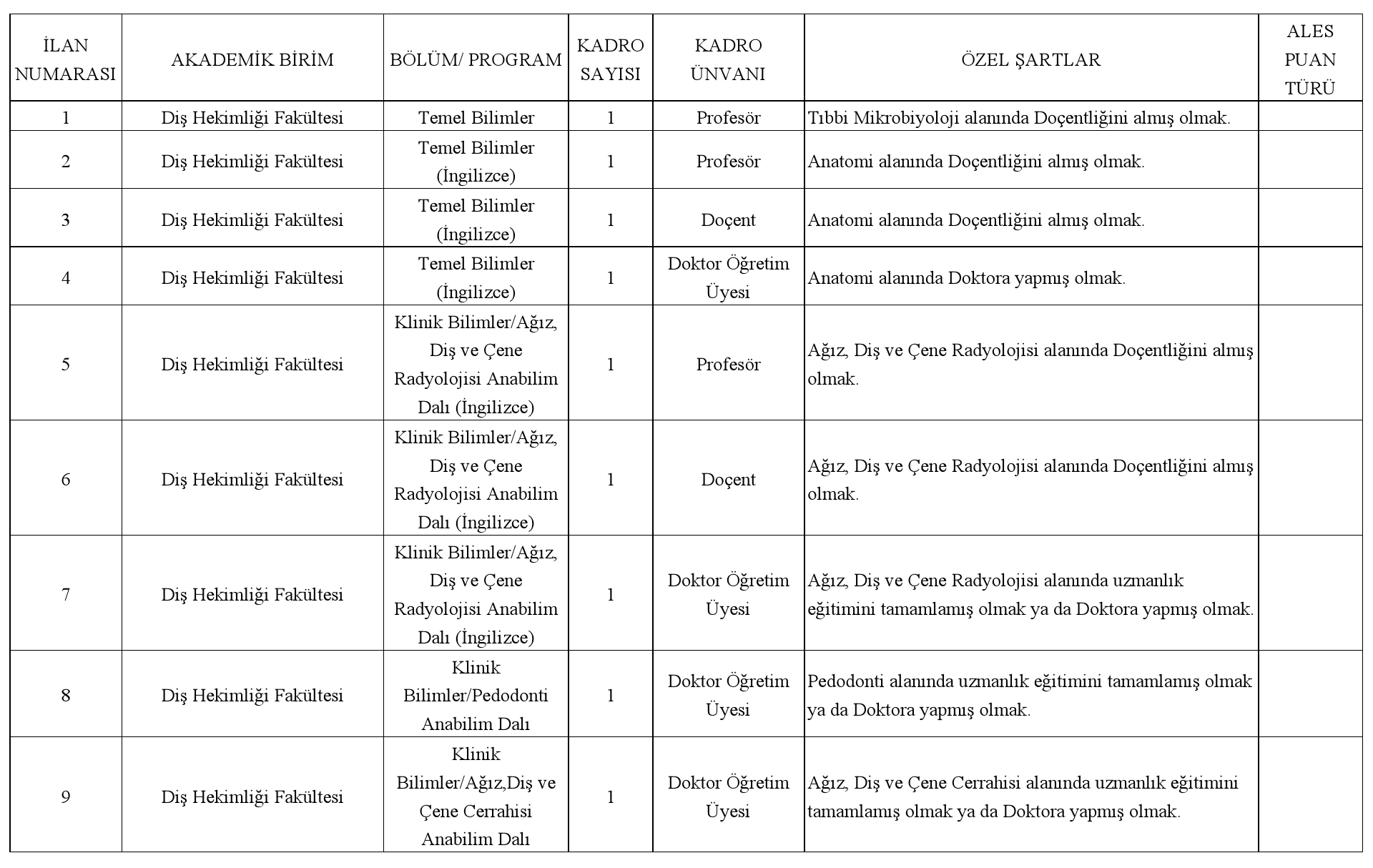 Adres:Profesör ve Doçent kadroları, Diş Hekimliği Fakültesi ve Yabancı Diller Yüksekokulu başvuruları için;
