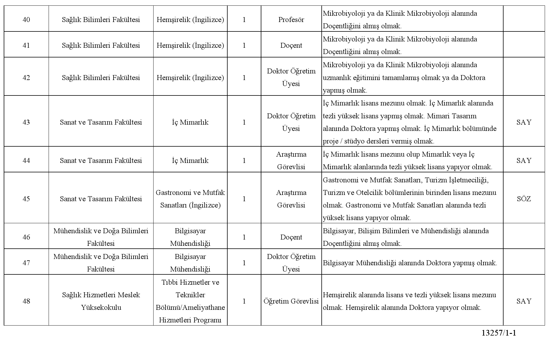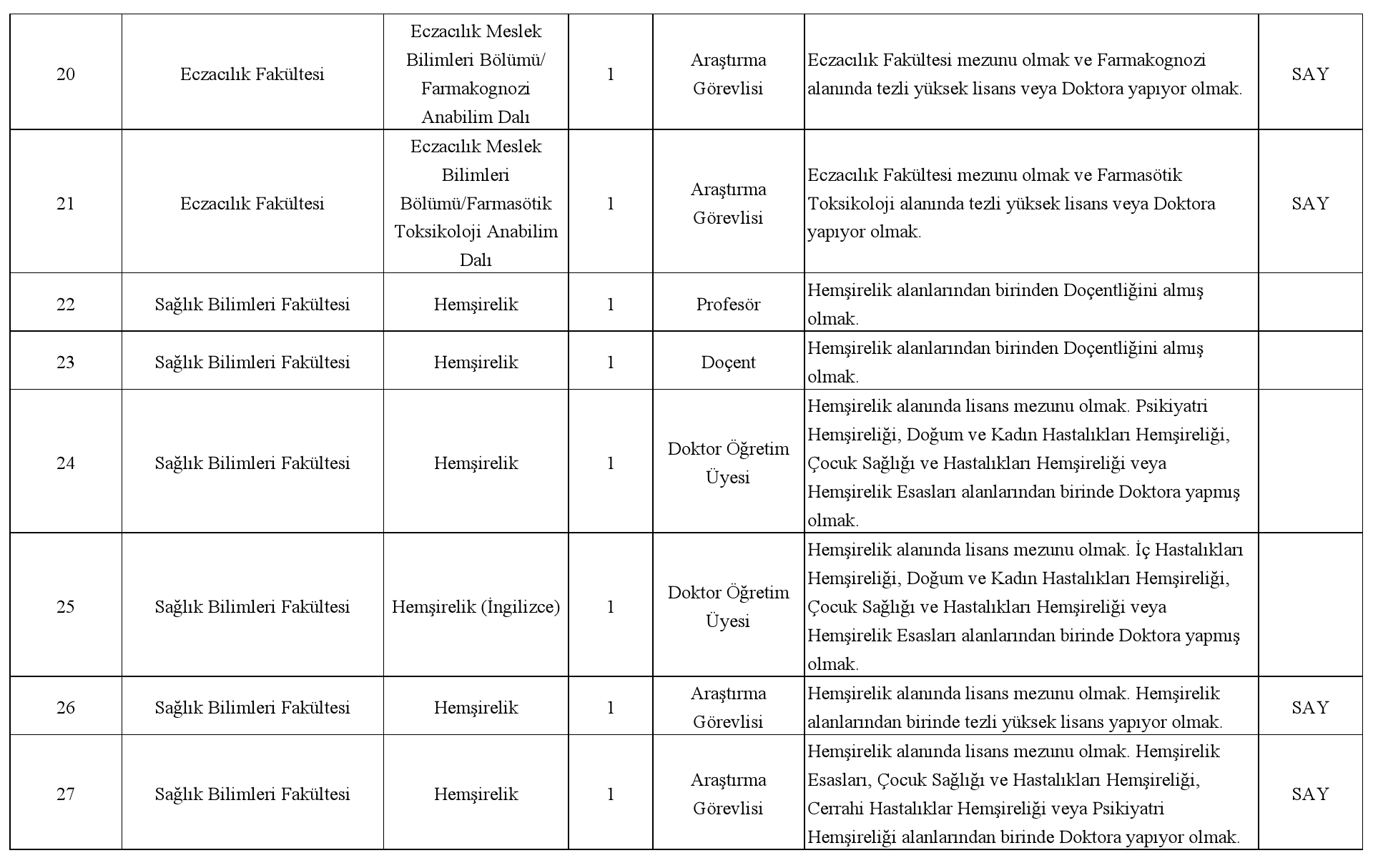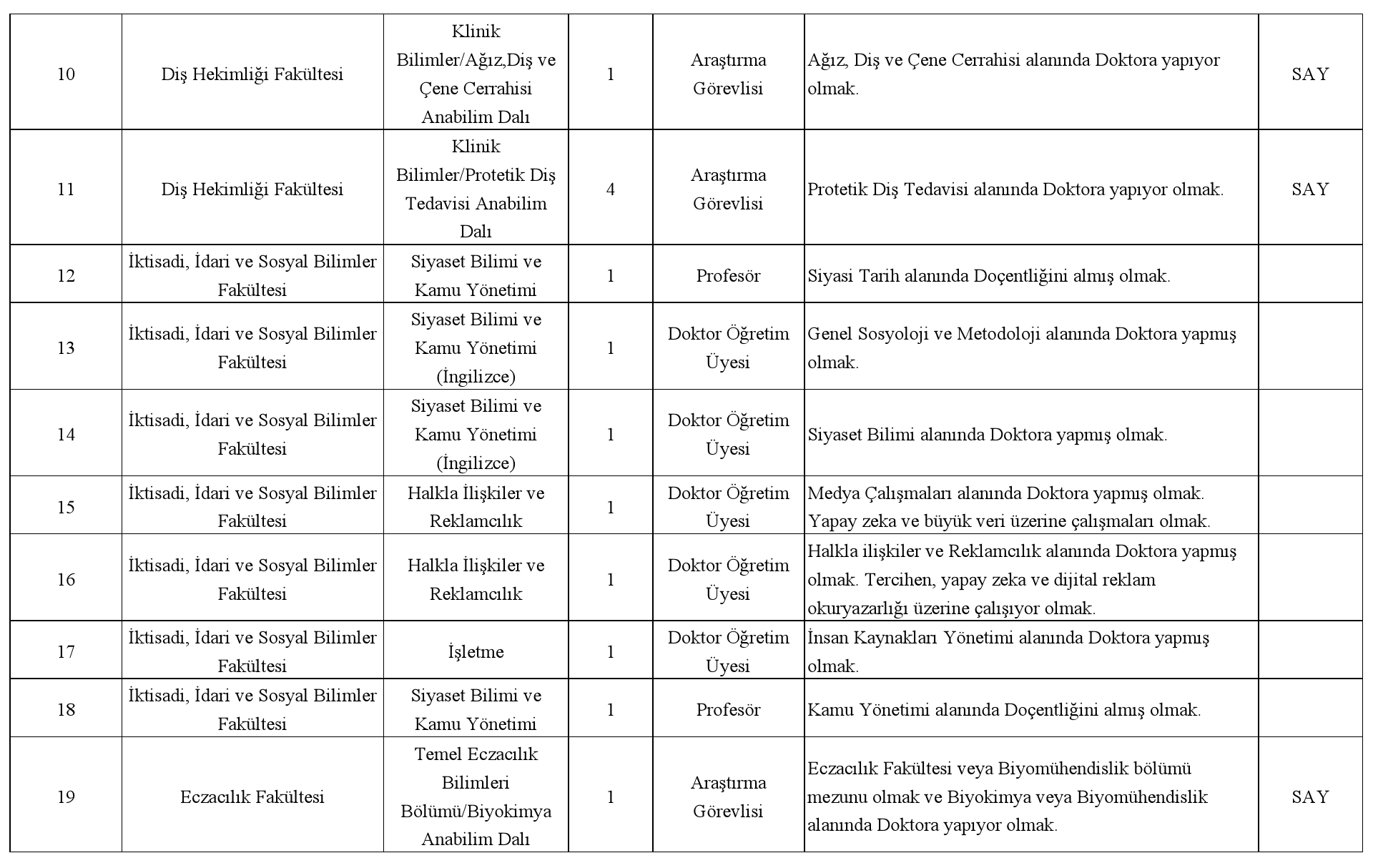 Üniversitemizin aşağıda belirtilen birimlerinde açık bulunan Profesör, Doçent ve Doktor Öğretim Üyesi kadrolarına 2547 sayılı Yükseköğretim Kanunu'nun 26. 24. ve 23. maddelerine ve Öğretim Üyeliğine Yükseltilme ve Atanma Yönetmeliğinin ilgili maddelerine göre Öğretim Üyeleri ile Öğretim Üyesi Dışındaki Öğretim Elemanı Kadrolarına Yapılacak Atamalarda Uygulanacak Merkezi Sınav ile Giriş Sınavlarına İlişkin Usul ve Esaslar Hakkında Yönetmelik hükümlerine göre Öğretim Görevlileri ve Araştırma Görevlileri alınacaktır.