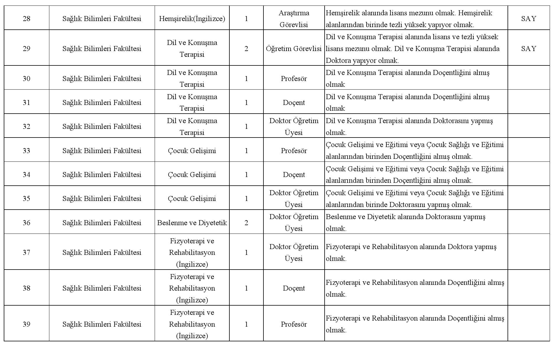 İngilizce bölümlerde, İngilizce eğitim verebilmek için YDS'den en az 85 puan veya eşdeğerliliği Yükseköğretim Kurulu Başkanlığınca kabul edilen bir kurumdan bu puanın eşdeğerinde bir puan almış olmak veya lisans ya da doktora eğitimini İngilizcenin ana dili olarak konuşulduğu ülkelerin birinde tamamlamış olmak.