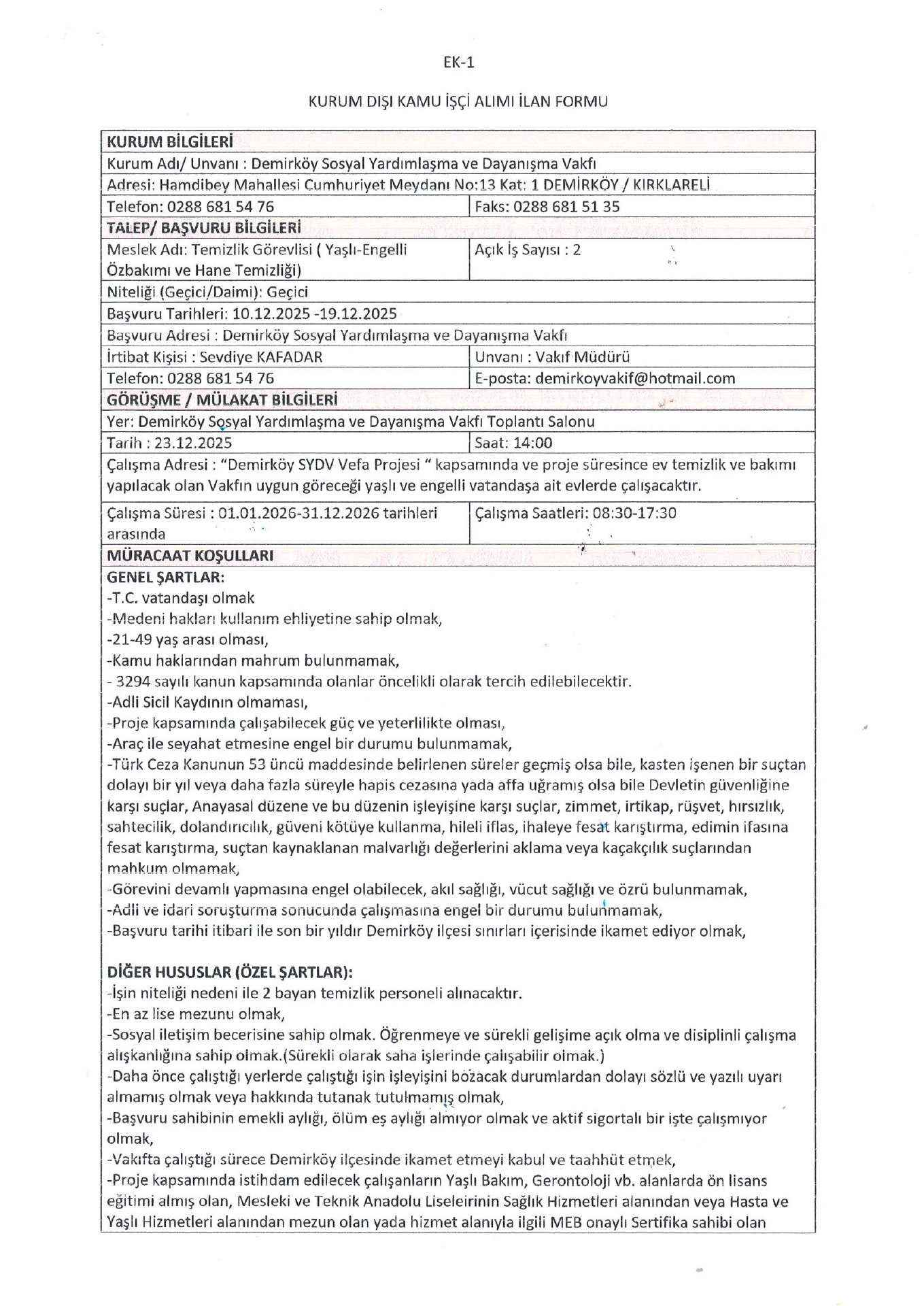 Ana sayfaSYDV İlanlarıAna sayfaGeçici İşçi İlanları Kırklareli Demirköy SYDV Geçici 2 İşçi Alacak Kırklareli Demirköy SYDV Geçici 2 İşçi Alacak. Son başvuru tarihi 19 Aralık 2025 Kaynak : İşkur İlan Giriş : 10 Aralık 2025 22:52, Son Güncelleme : 10 Aralık 2025 23:15 Yazdır Yorumlar (0) Abone Ol