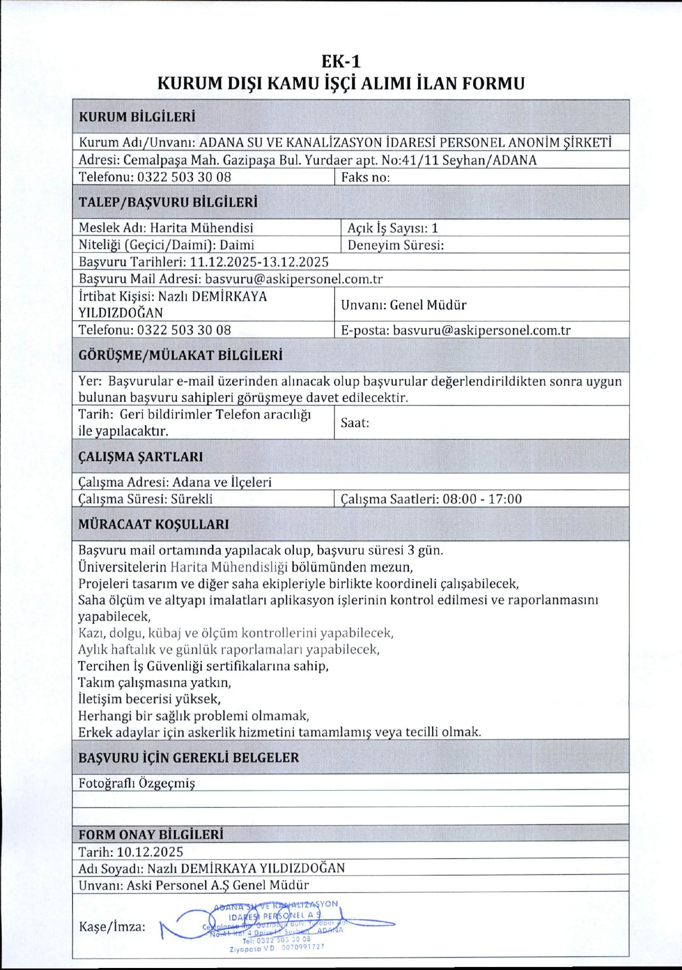 Ana sayfaDaimi İşçi İlanları Adana Su ve Kanalizasyon İdaresi 1 İşçi Alacak Adana Su ve Kanalizasyon İdaresi 1 İşçi Alacak. Son başvuru tarihi 13 Arlaık 2025 Kaynak : İşkur İlan Giriş : 12 Aralık 2025 00:05, Son Güncelleme : 12 Aralık 2025 04:01 Yazdır Yorumlar (0) Abone Ol