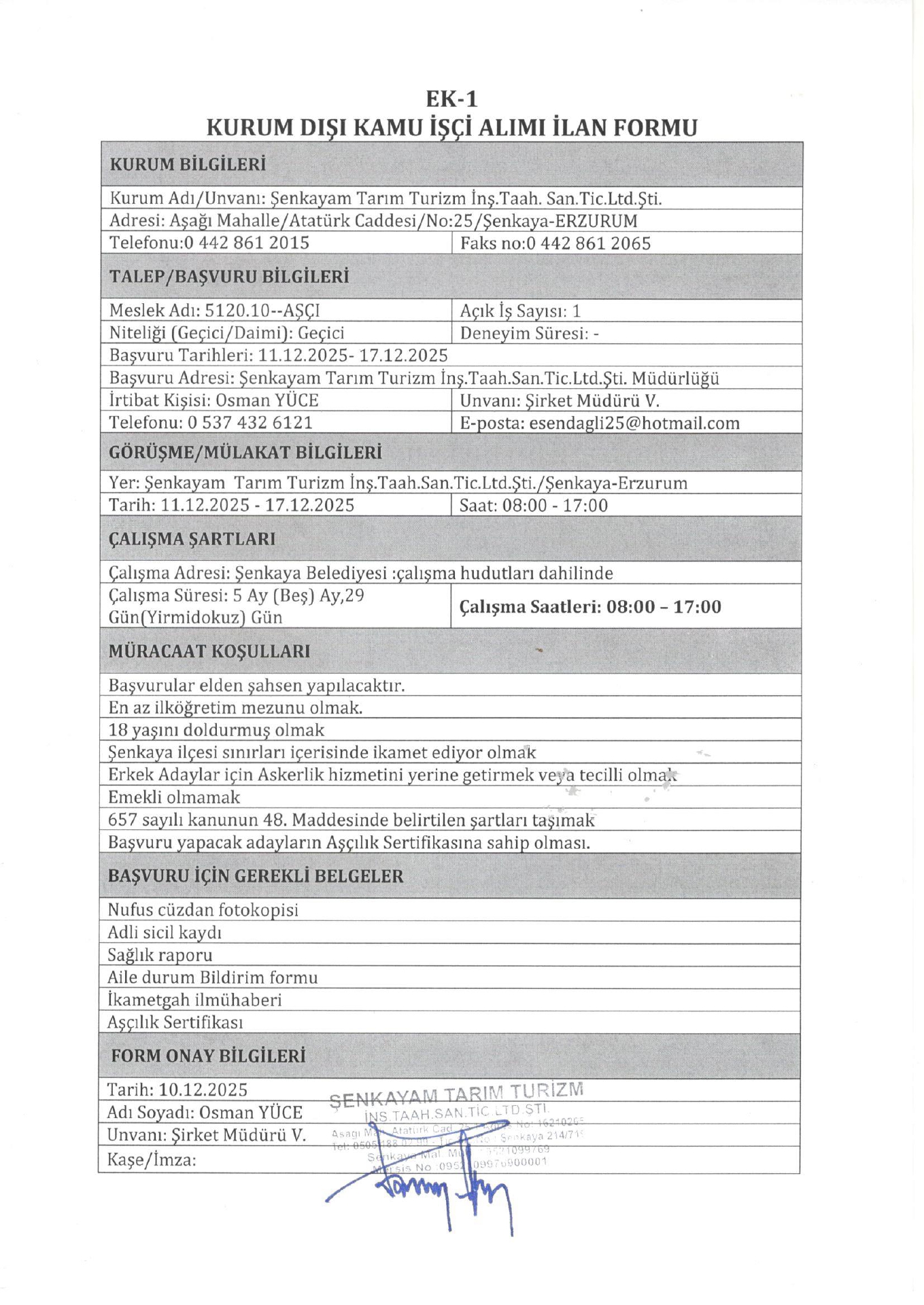 Ana sayfaGeçici İşçi İlanları Erzurum Şenkayam Tarım Geçici 1 İşçi Alacak Erzurum Şenkayam Tarım Geçici 1 İşçi Alacak. Son başvuru tarihi 17 Arlaık 2025 Kaynak : İşkur İlan Giriş : 12 Aralık 2025 00:18, Son Güncelleme : 12 Aralık 2025 03:57 Yazdır Yorumlar (0) Abone Ol