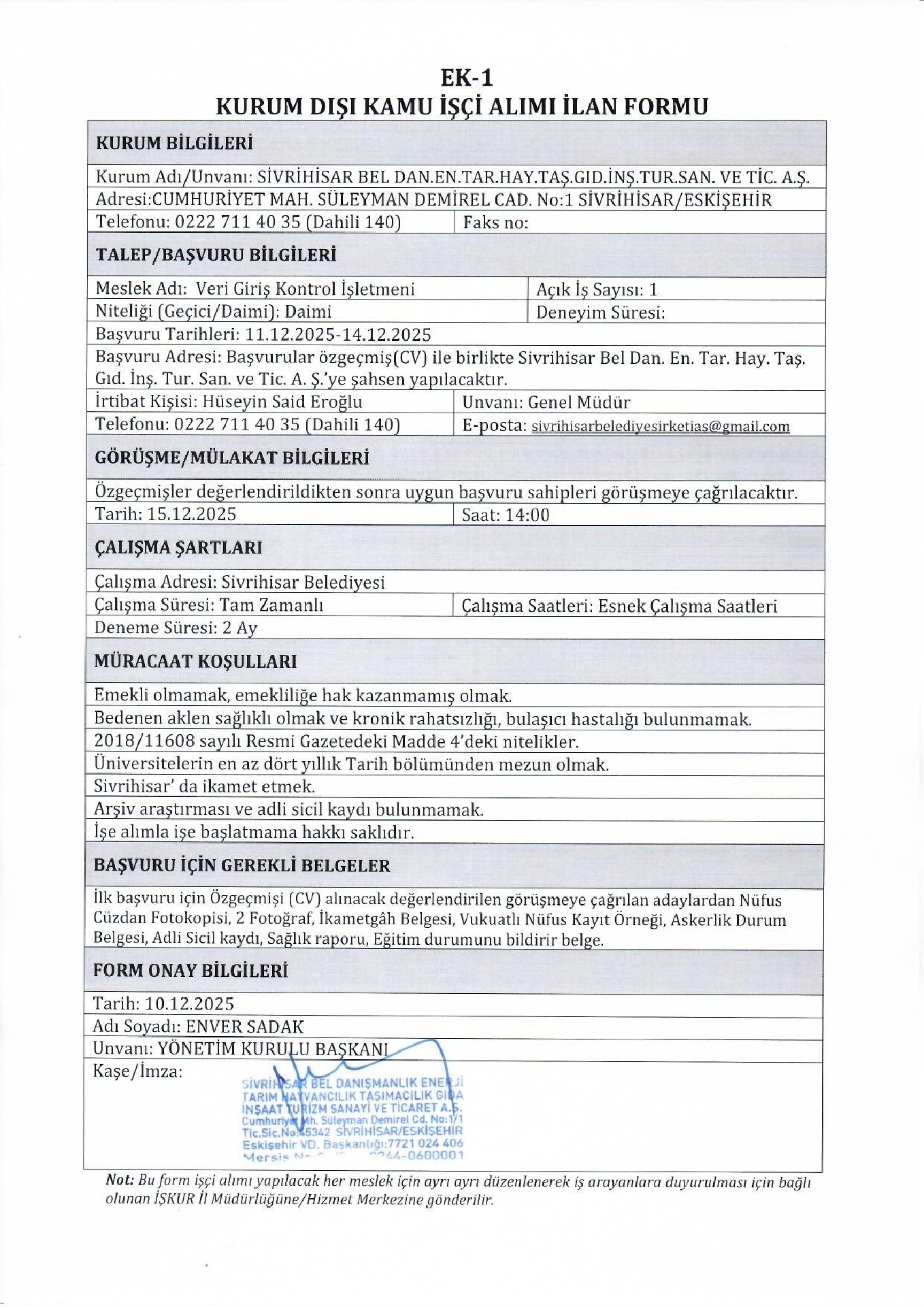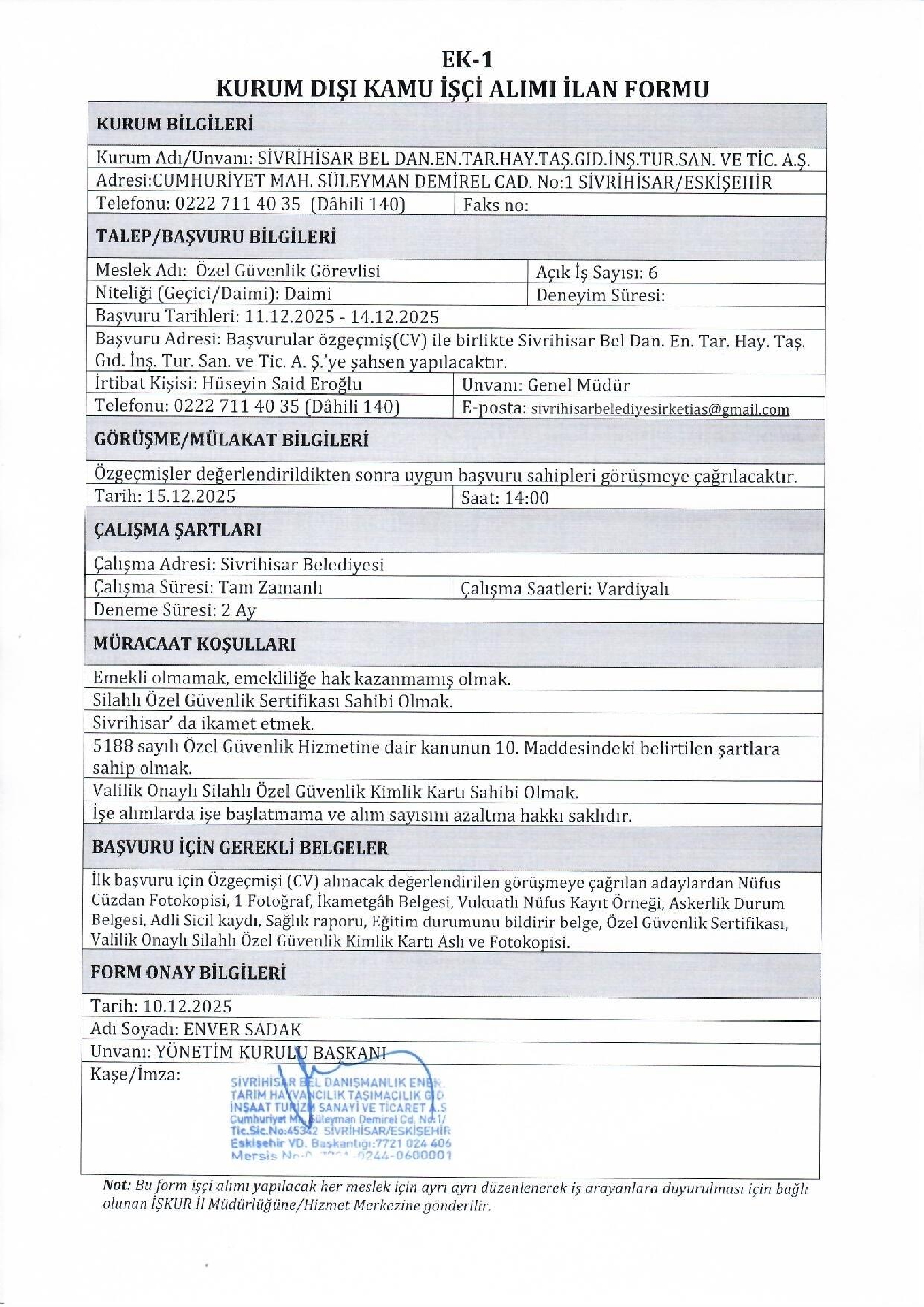 Ana sayfaDaimi İşçi İlanları Eskişehir Sivrihisar Belediyesi 7 İşçi Alacak Eskişehir Sivrihisar Belediyesi 7 İşçi Alacak. Son başvuru tarihi 14 Arlaık 2025 Kaynak : İşkur İlan Giriş : 12 Aralık 2025 00:21, Son Güncelleme : 12 Aralık 2025 03:56 Yazdır Yorumlar (0) Abone Ol