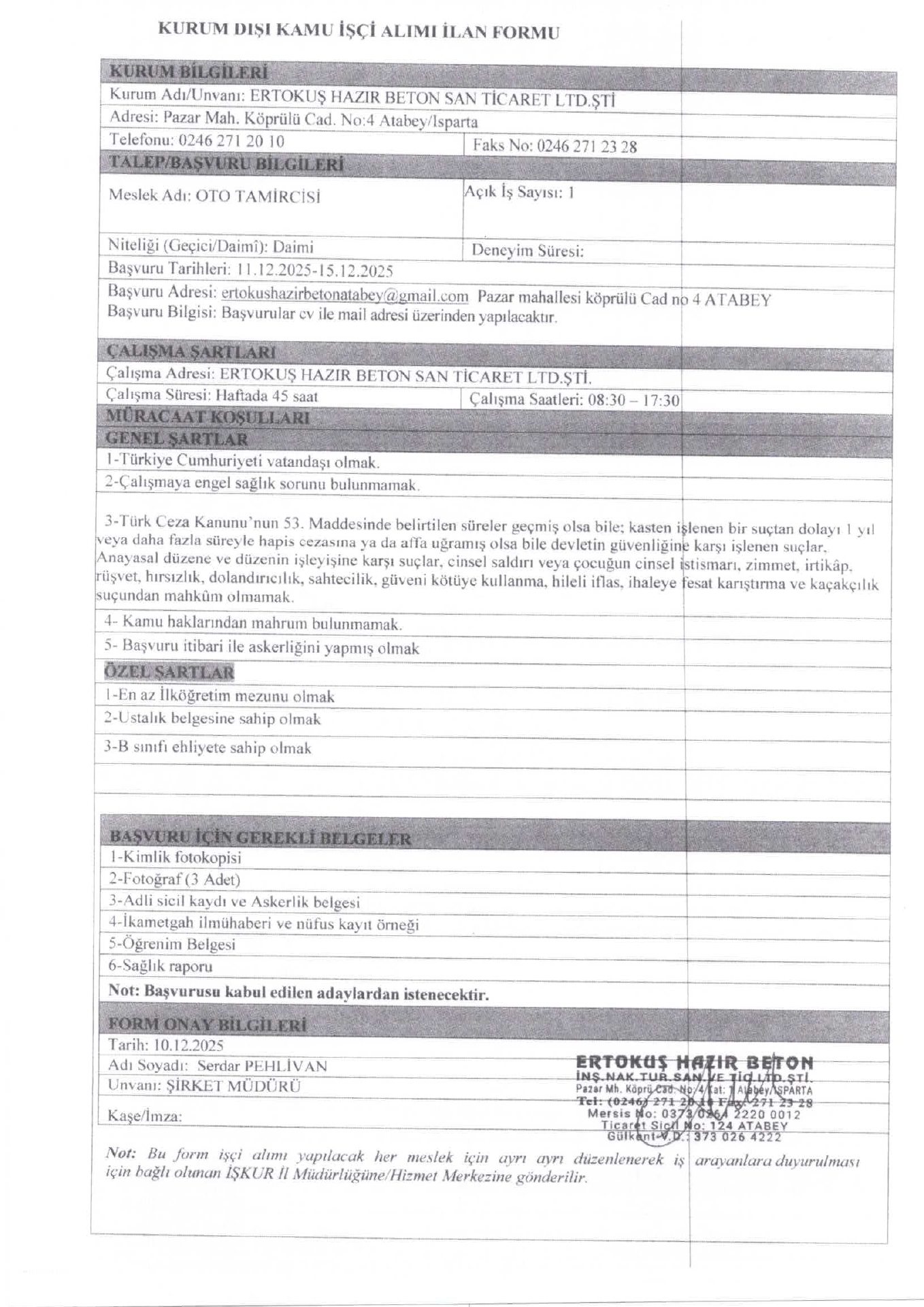 Ana sayfaDaimi İşçi İlanları Isparta Atabey Belediyesi 1 İşçi Alacak Isparta Atabey Belediyesi 1 İşçi Alacak. Son başvuru tarihi 15 Arlaık 2025 Kaynak : İşkur İlan Giriş : 12 Aralık 2025 00:27, Son Güncelleme : 12 Aralık 2025 03:55 Yazdır Yorumlar (0) Abone Ol