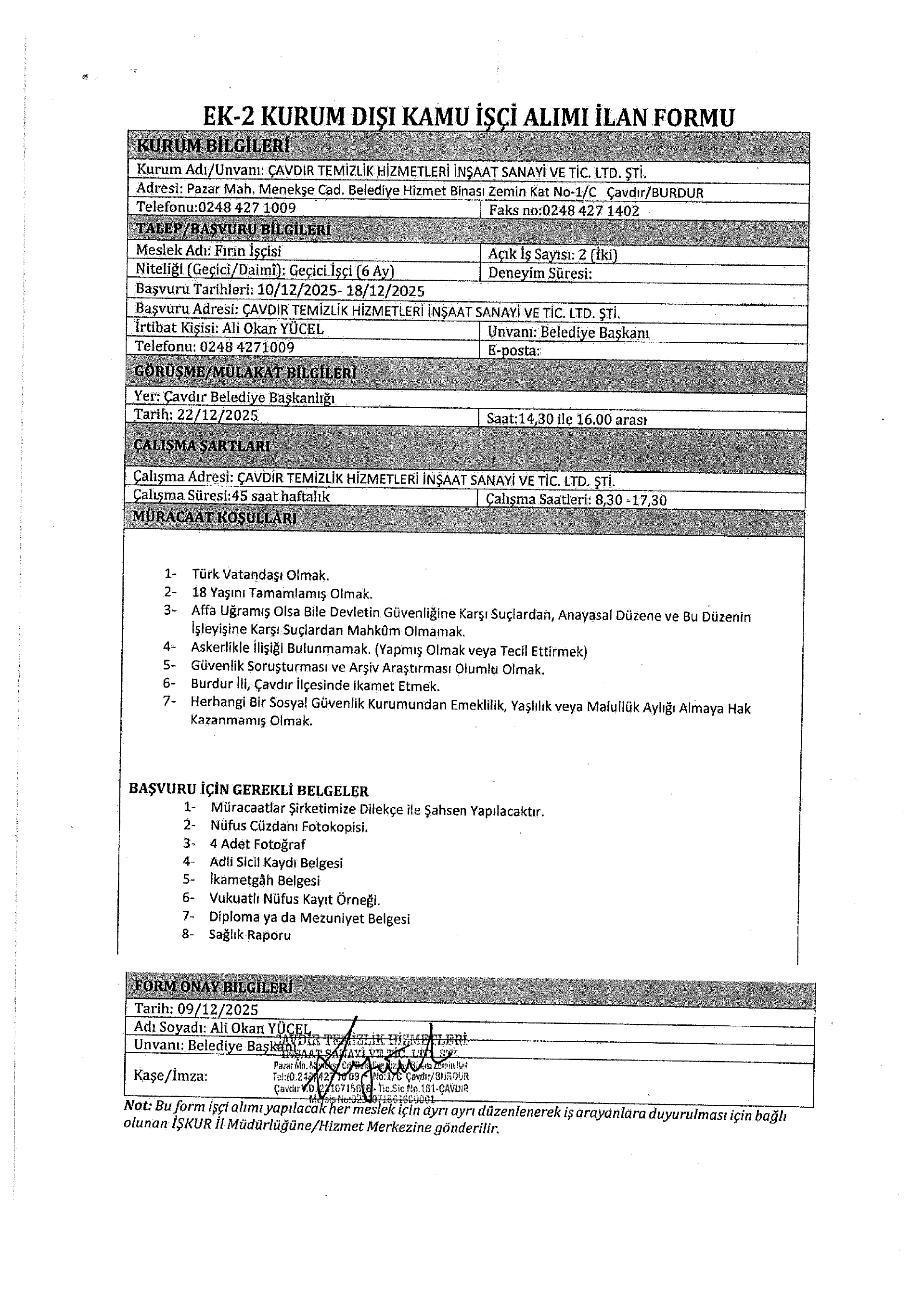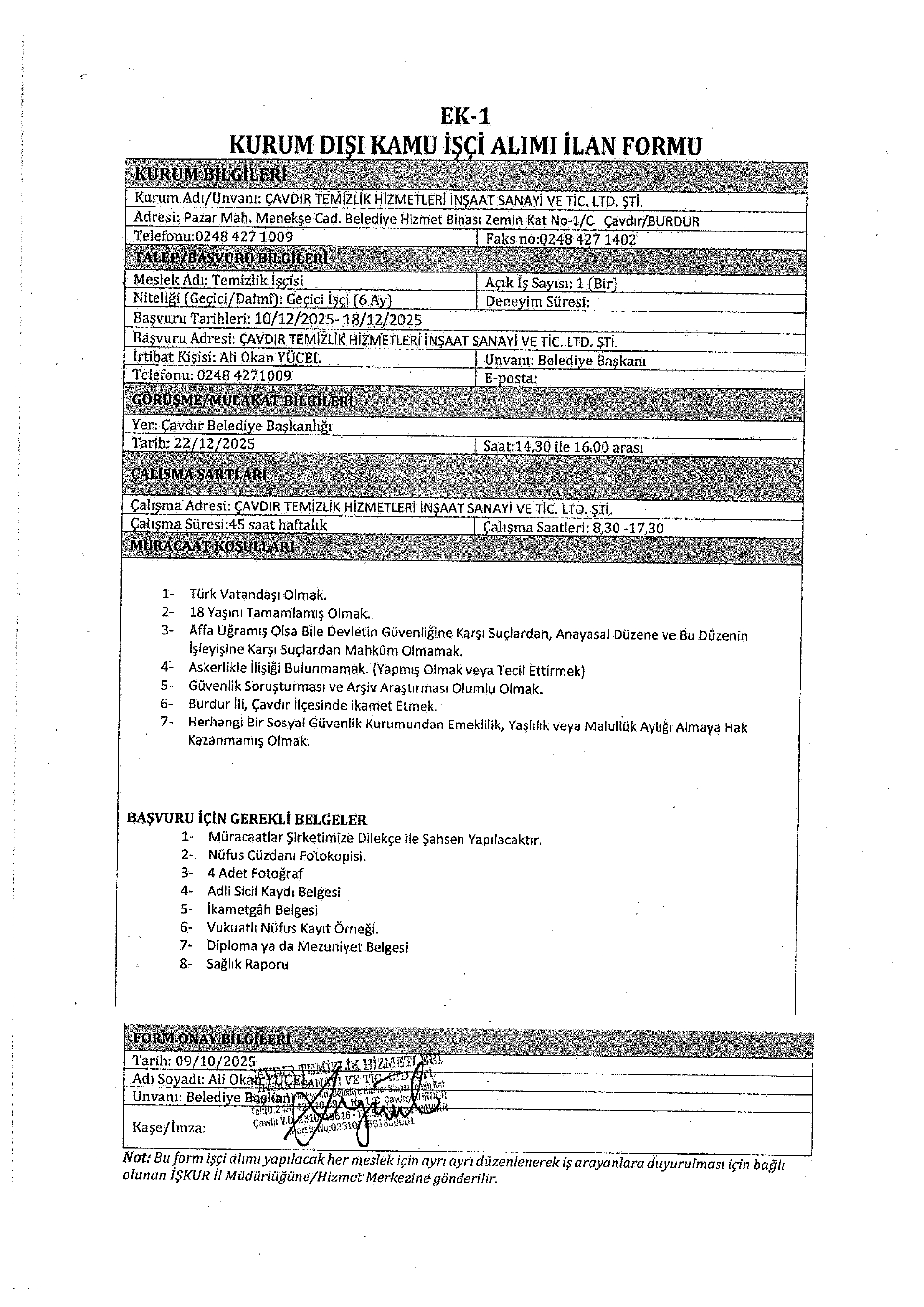 Ana sayfaGeçici İşçi İlanları Burdur Çavdır Temizlik Geçici 3 İşçi Alacak Burdur Çavdır Temizlik Geçici 3 İşçi Alacak. Son başvuru tarihi 18 Aralık 2025 Kaynak : İşkur İlan Giriş : 12 Aralık 2025 23:19, Son Güncelleme : 12 Aralık 2025 23:33 Yazdır Yorumlar (0) Abone Ol