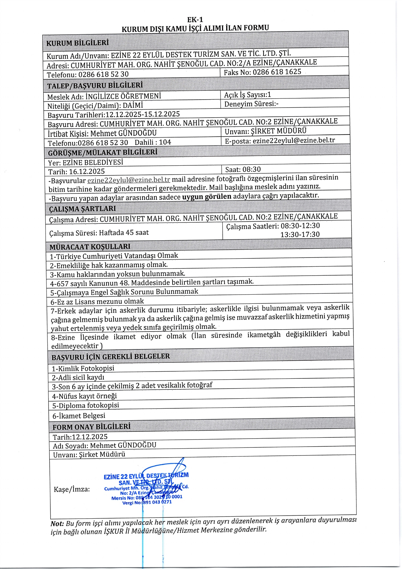 Ana sayfaDaimi İşçi İlanları Çanakkale Ezine 22 Eylül Destek Turizm 1 İşçi Alacak Çanakkale Ezine 22 Eylül Destek Turizm 1 İşçi Alacak. Son başvuru tarihi 15 Aralık 2025 Kaynak : İşkur İlan Giriş : 12 Aralık 2025 23:23, Son Güncelleme : 12 Aralık 2025 23:33 Yazdır Yorumlar (0) Abone Ol