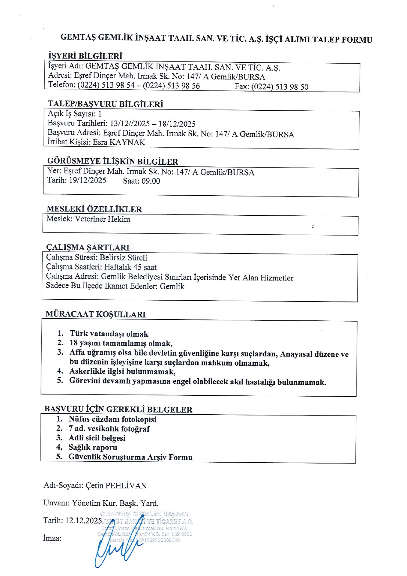 Ana sayfaDaimi İşçi İlanları Bursa Gemtaş 1 İşçi Alacak Bursa Gemtaş 1 İşçi Alacak. Son başvuru tarihi 18 Aralık 2025 Kaynak : İşkur İlan Giriş : 12 Aralık 2025 23:26, Son Güncelleme : 12 Aralık 2025 23:32 Yazdır Yorumlar (0) Abone Ol