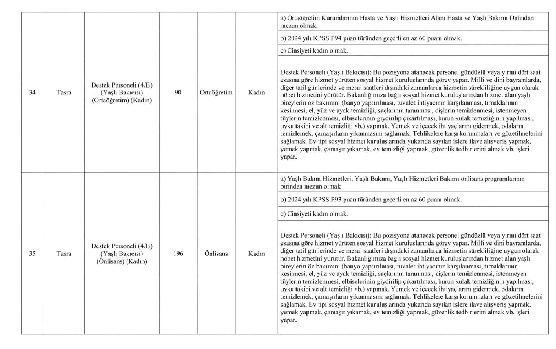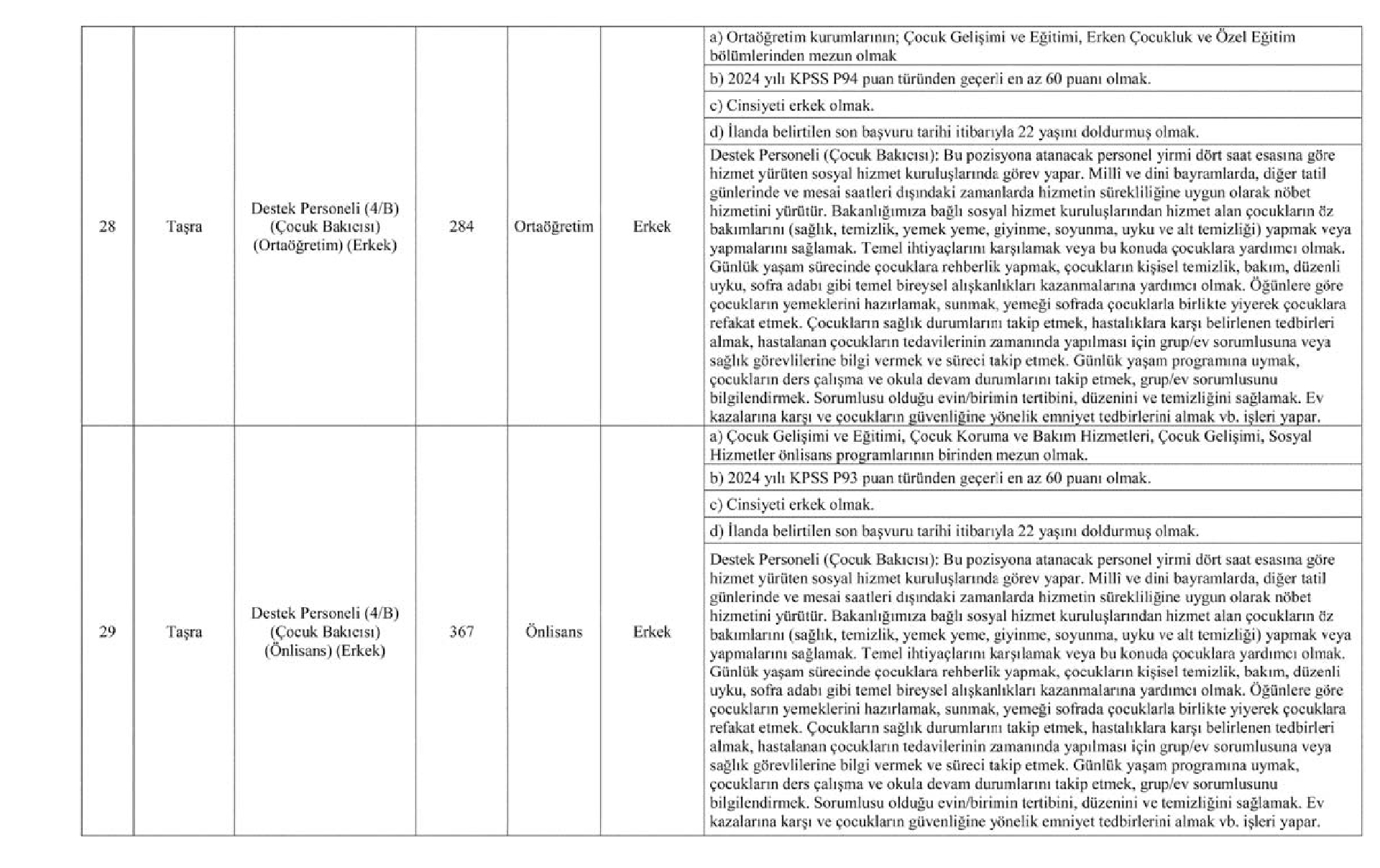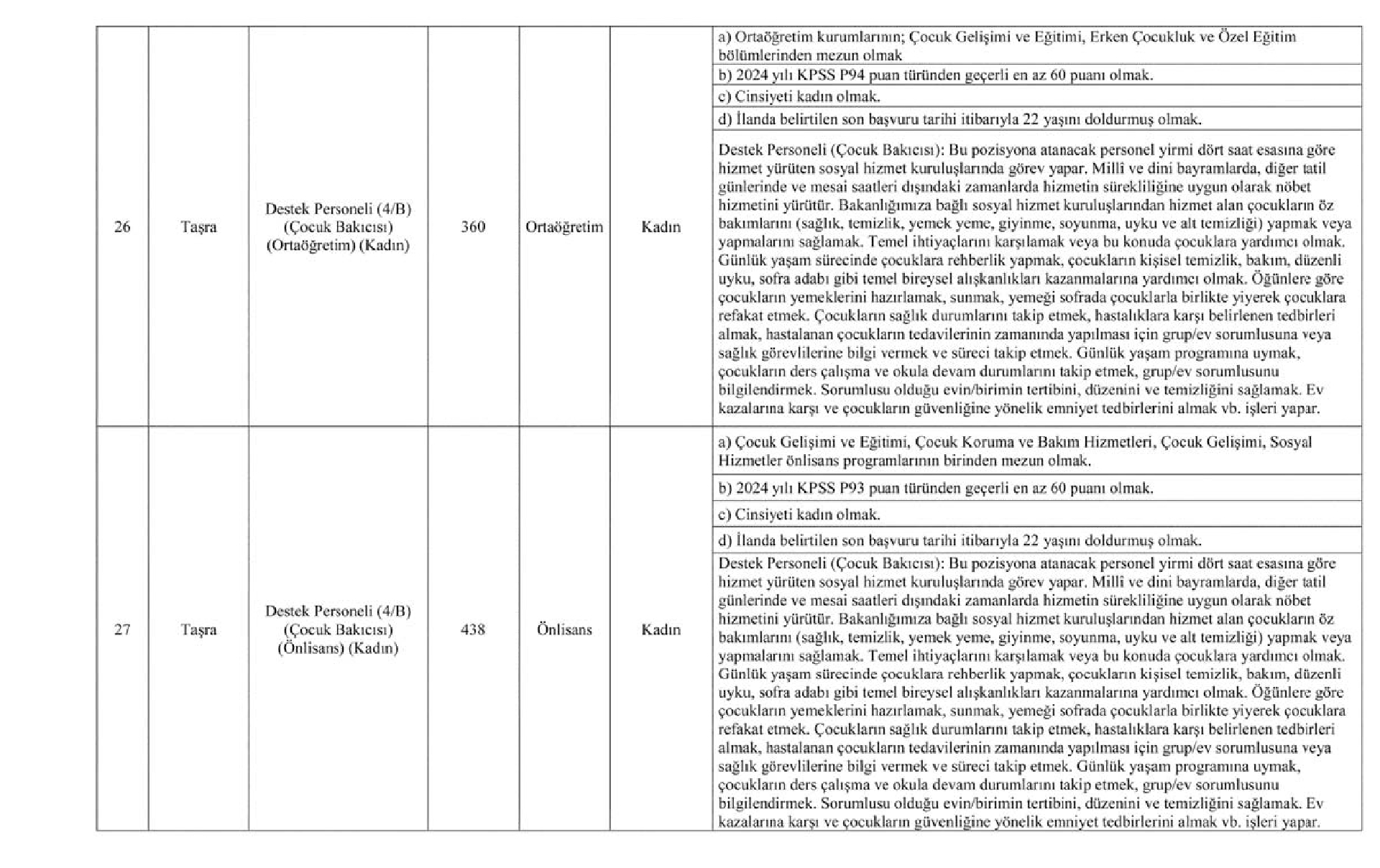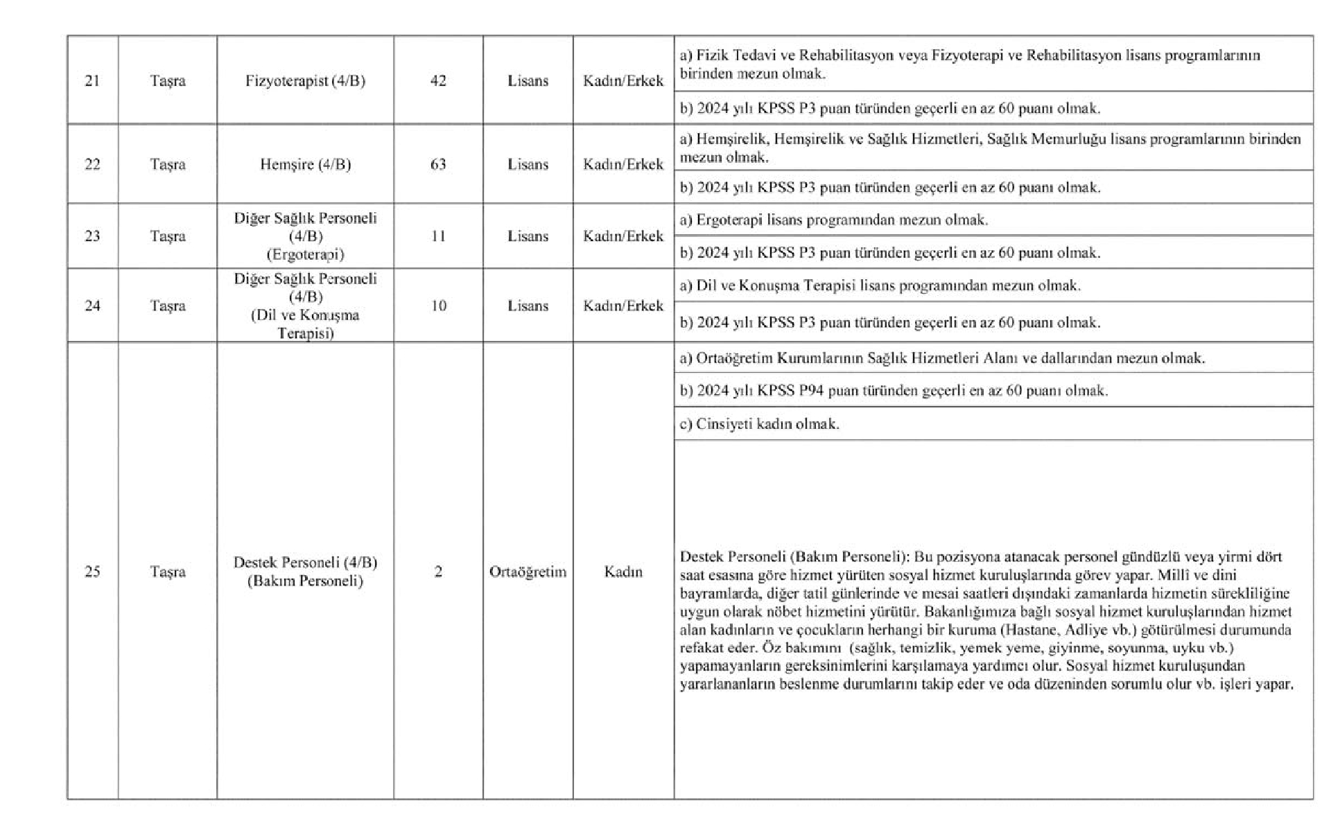 Aile ve Sosyal Hizmetler Bakanlığı Merkez ve Taşra Teşkilatında 657 sayılı Devlet Memurları Kanununun 4/B maddesi kapsamında çalıştırılmak üzere, 06.06.1978 tarihli ve 7/15754 sayılı Bakanlar Kurulu Kararı ile yürürlüğe konulan "Sözleşmeli Personel Çalıştırılmasına İlişkin Esaslar" kapsamında KPSS (B) grubu puan sıralaması esas alınmak suretiyle Özel Nitelikler tablosunda belirtilen ünvan ve sayıda toplam 3.000 (üç bin) sözleşmeli personel pozisyonlarına yerleştirme yapılacaktır.
