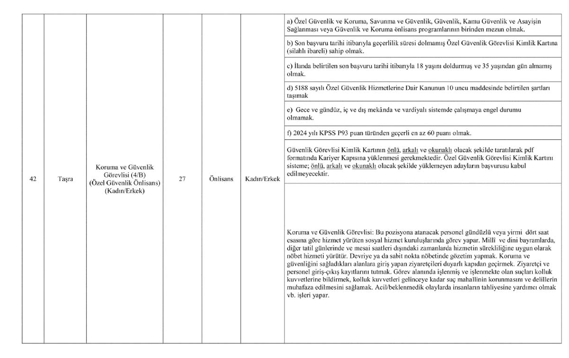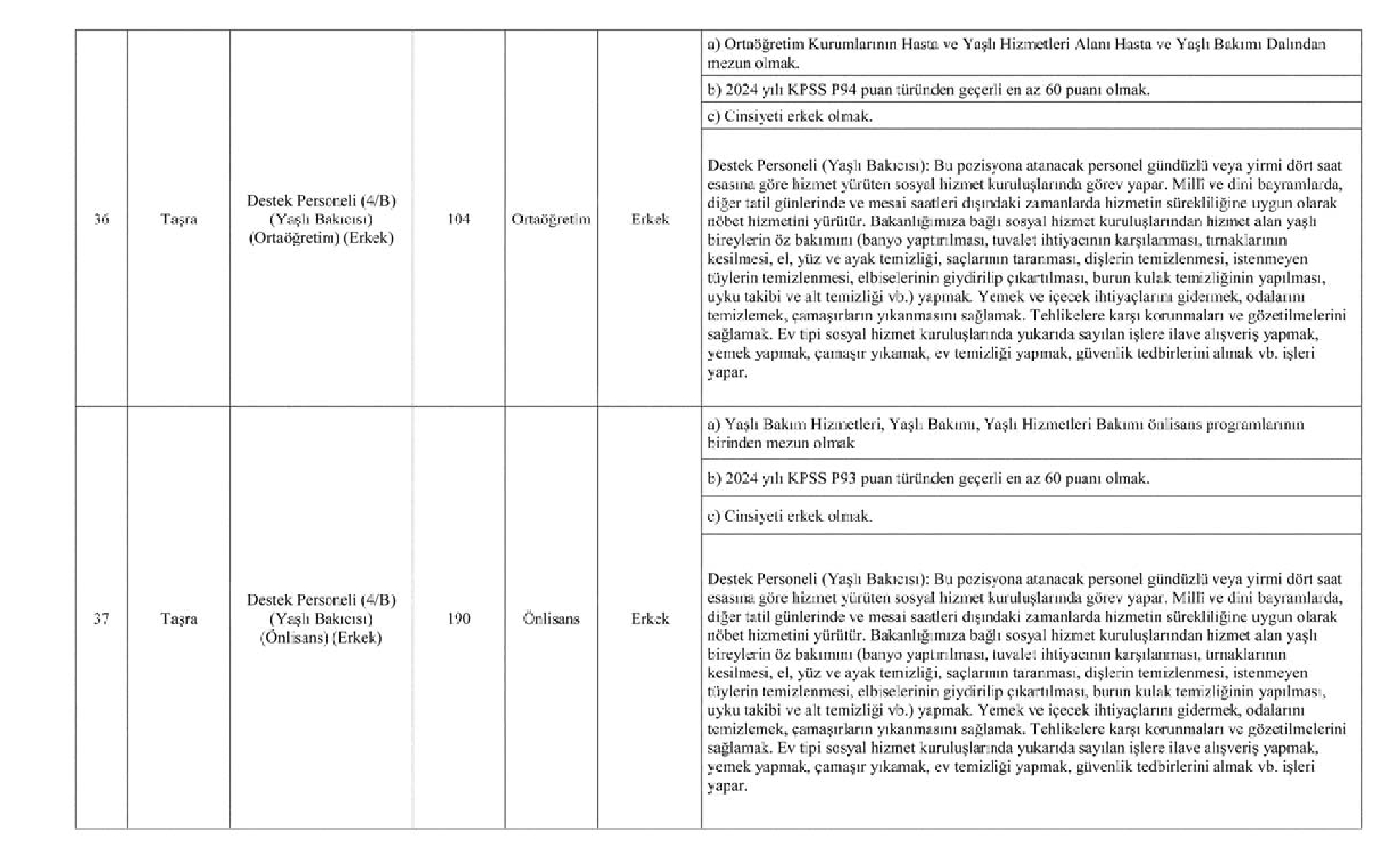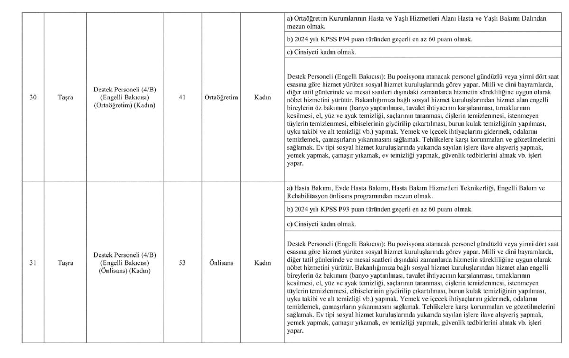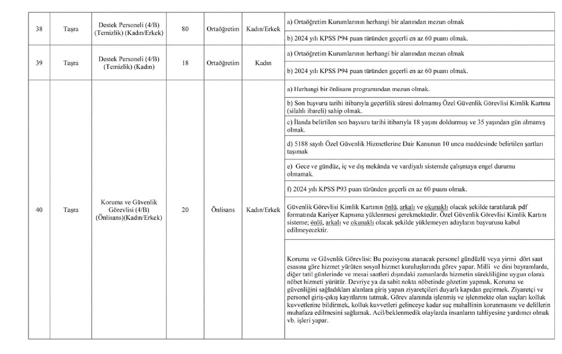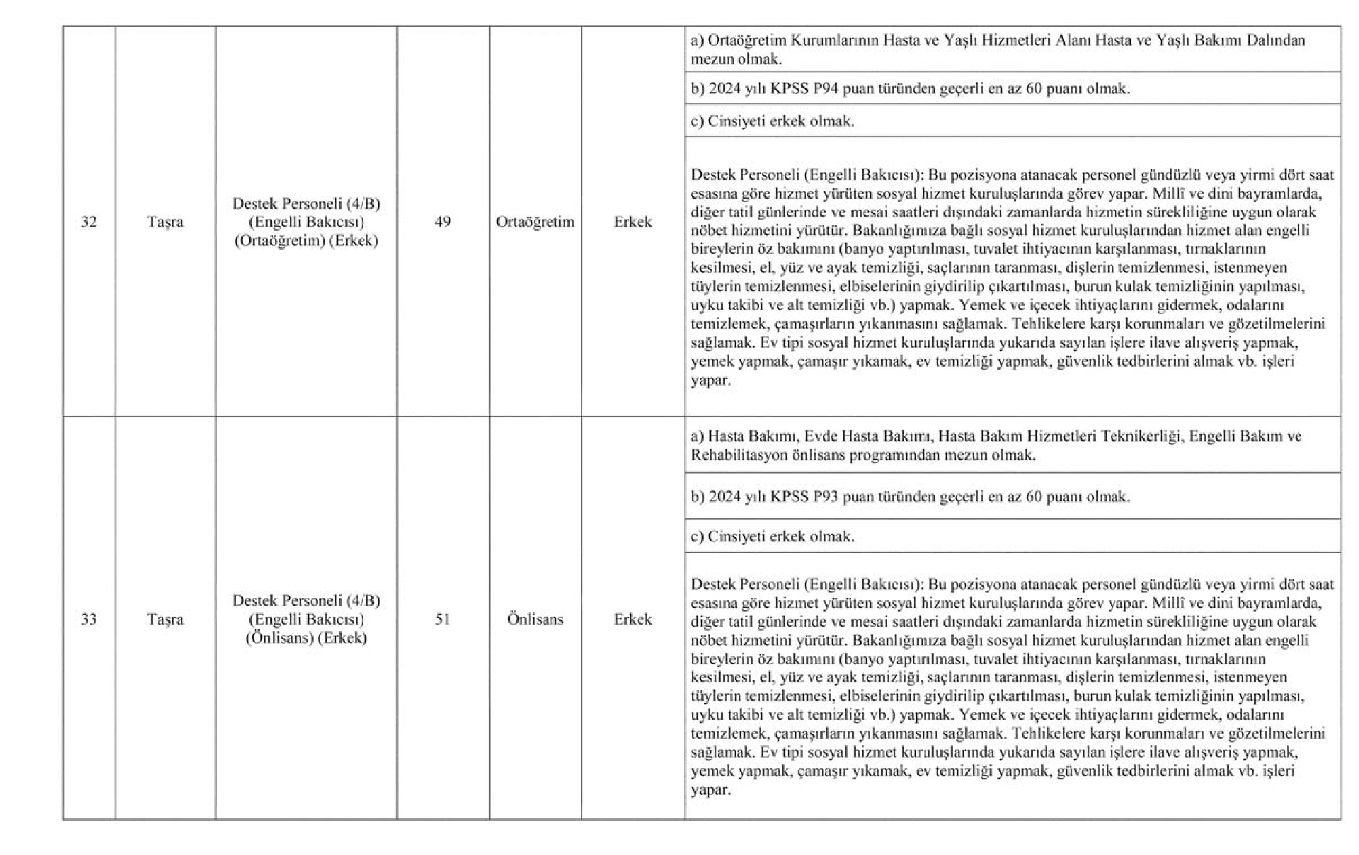 Aile ve Sosyal Hizmetler Bakanlığı Merkez ve Taşra Teşkilatında 657 sayılı Devlet Memurları Kanununun 4/B maddesi kapsamında çalıştırılmak üzere, 06.06.1978 tarihli ve 7/15754 sayılı Bakanlar Kurulu Kararı ile yürürlüğe konulan "Sözleşmeli Personel Çalıştırılmasına İlişkin Esaslar" kapsamında KPSS (B) grubu puan sıralaması esas alınmak suretiyle Özel Nitelikler tablosunda belirtilen ünvan ve sayıda toplam 3.000 (üç bin) sözleşmeli personel pozisyonlarına yerleştirme yapılacaktır.