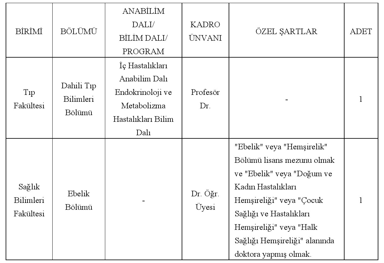 Üniversitemizin aşağıda belirtilen birimlerine 2547 sayılı Yükseköğretim Kanunu ile Öğretim Üyeliğine Yükseltilme ve Atanma Yönetmeliğinin ilgili maddeleri uyarınca, Üniversitemiz Öğretim Üyeliğine Yükseltme ve Atama Kriterlerini sağlamış olmak koşuluyla Öğretim Üyeleri alınacaktır.