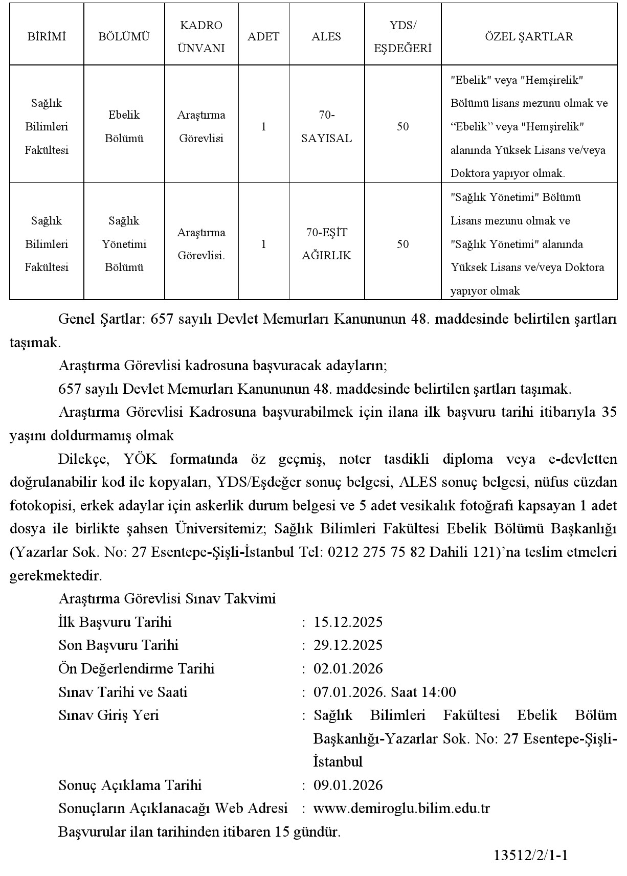 Başvurular ilan tarihinden itibaren 15 gündür.