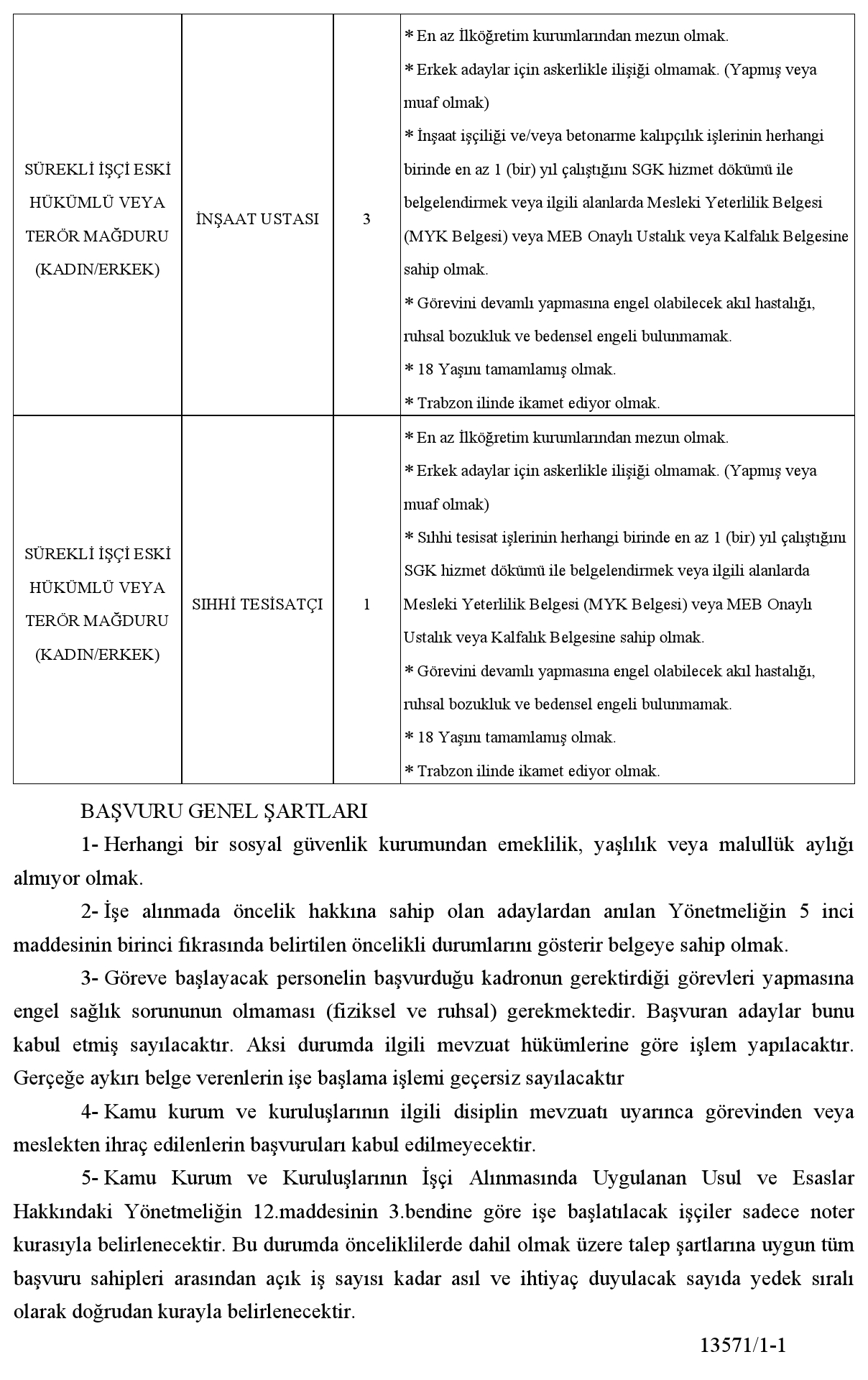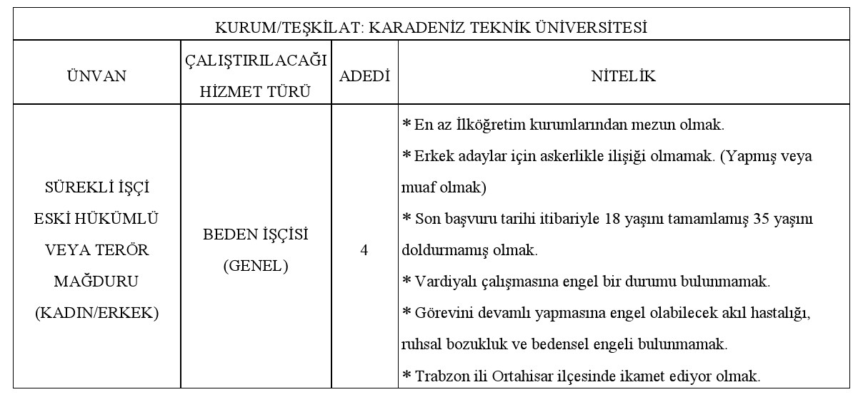 1- 4857 sayılı İş Kanunu'nun 30'uncu maddesi ve ilgili hükümleri ile mezkür kanuna dayanılarak çıkarılan kamu kurum ve kuruluşlarına Eski Hükümlü veya Terörle Mücadelede Malul Sayılmayacak Şekilde Yararlananların işçi Olarak Alınmasında Uygulanacak Usul ve Esaslar Hakkında Yönetmelik hükümleri uyarınca Karadeniz Teknik Üniversitesi Merkez veya Taşra teşkilatında istihdam edilmek üzere 8 Eski Hükümlü / TMY statüsünde sürekli işçi alımı yapılacaktır.