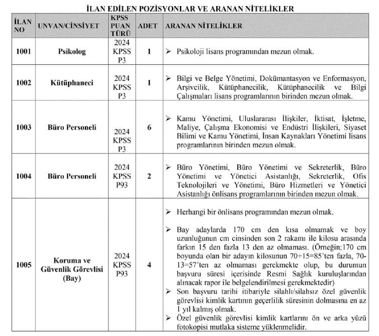 15-Tüm pozisyonlar için ilave şart; Son başvuru tarihi itibarıyla 45 (kırk beş) yaşını doldurmamış olmak.