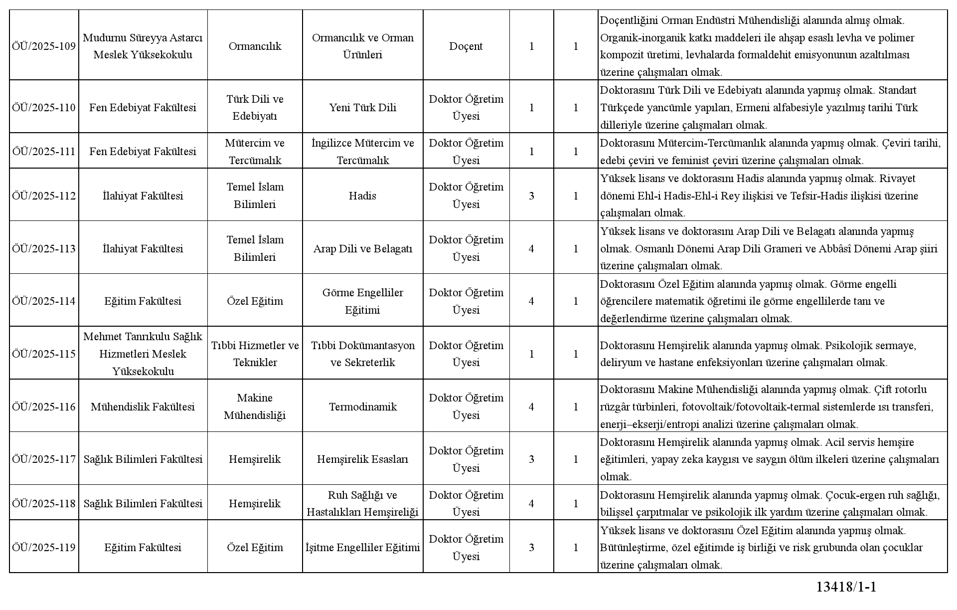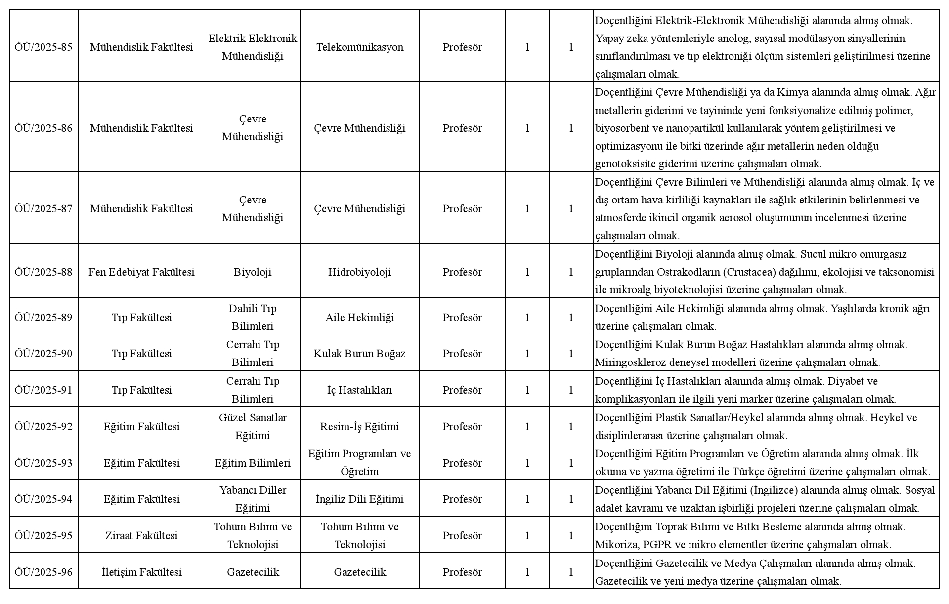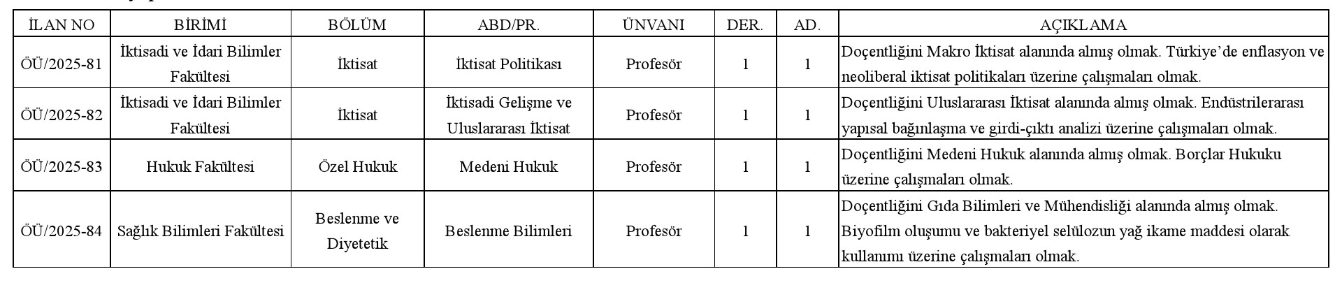 Not: 2547 sayılı Kanun'un ek 38. maddesi uyarınca belirlenen %30 kota kapsamında başvuru yapılabilecek doktor öğretim üyesi kadrosu bulunmamaktadır.