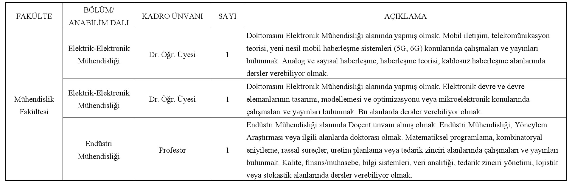 Eğitim-Öğretim dili Hukuk Fakültesinde %30, diğer Fakültelerde %100 İngilizce olan, tüm bölümlerinde "Flipped Learning" öğretim modelinin uygulandığı Üniversitemiz İktisadi, İdari ve Sosyal Bilimler Fakültesi ve Mühendislik Fakültesine 2547 sayılı Yükseköğretim Kanununun, Öğretim Üyeliğine Yükseltilme ve Atanma Yönetmeliği'nin ilgili maddeleri ile Üniversitemiz Öğretim Üyesi Yükseltme ve Atama Ölçütleri uyarınca, aşağıdaki açıklama kısmında belirtilen alanlarda uzmanlaşmış, aylık ve özlük hakları yönünden 4857 sayılı İş Kanunu hükümlerine tabi, tam gün görev yapacak öğretim elemanları alınacaktır.