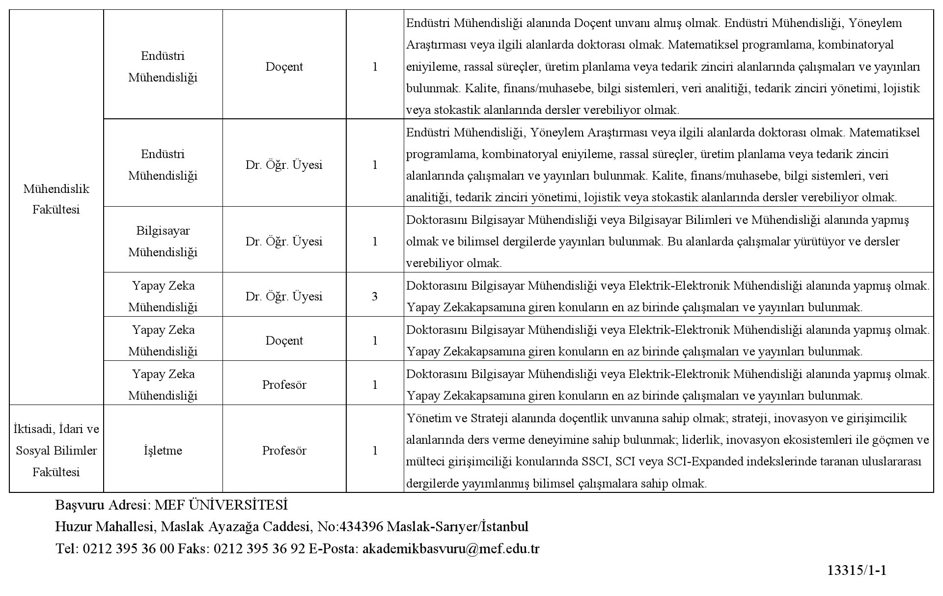 MEF Üniversitesi Öğretim Üyesi Alım İlanı. Son başvuru tarihi 29 Aralık 2025