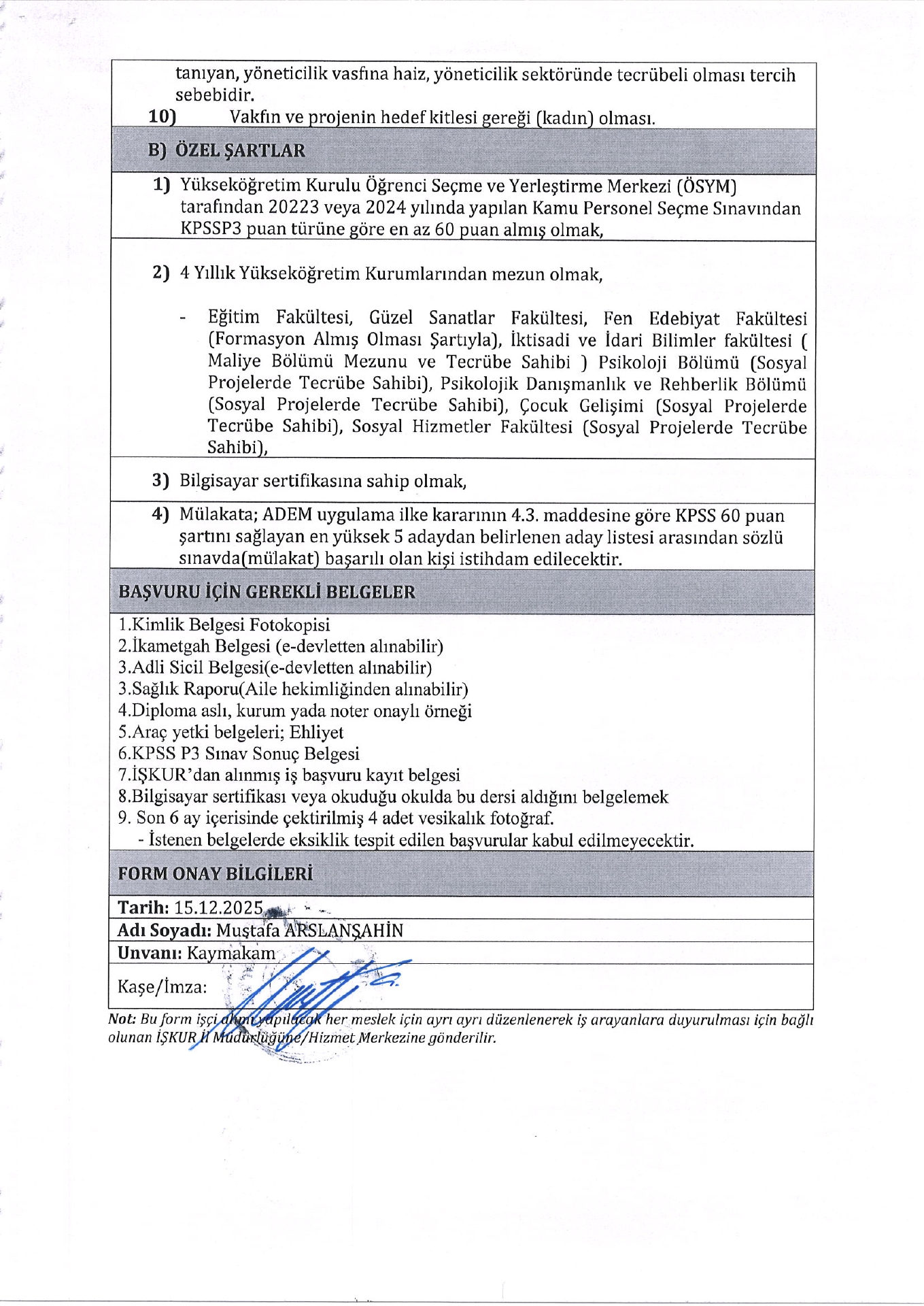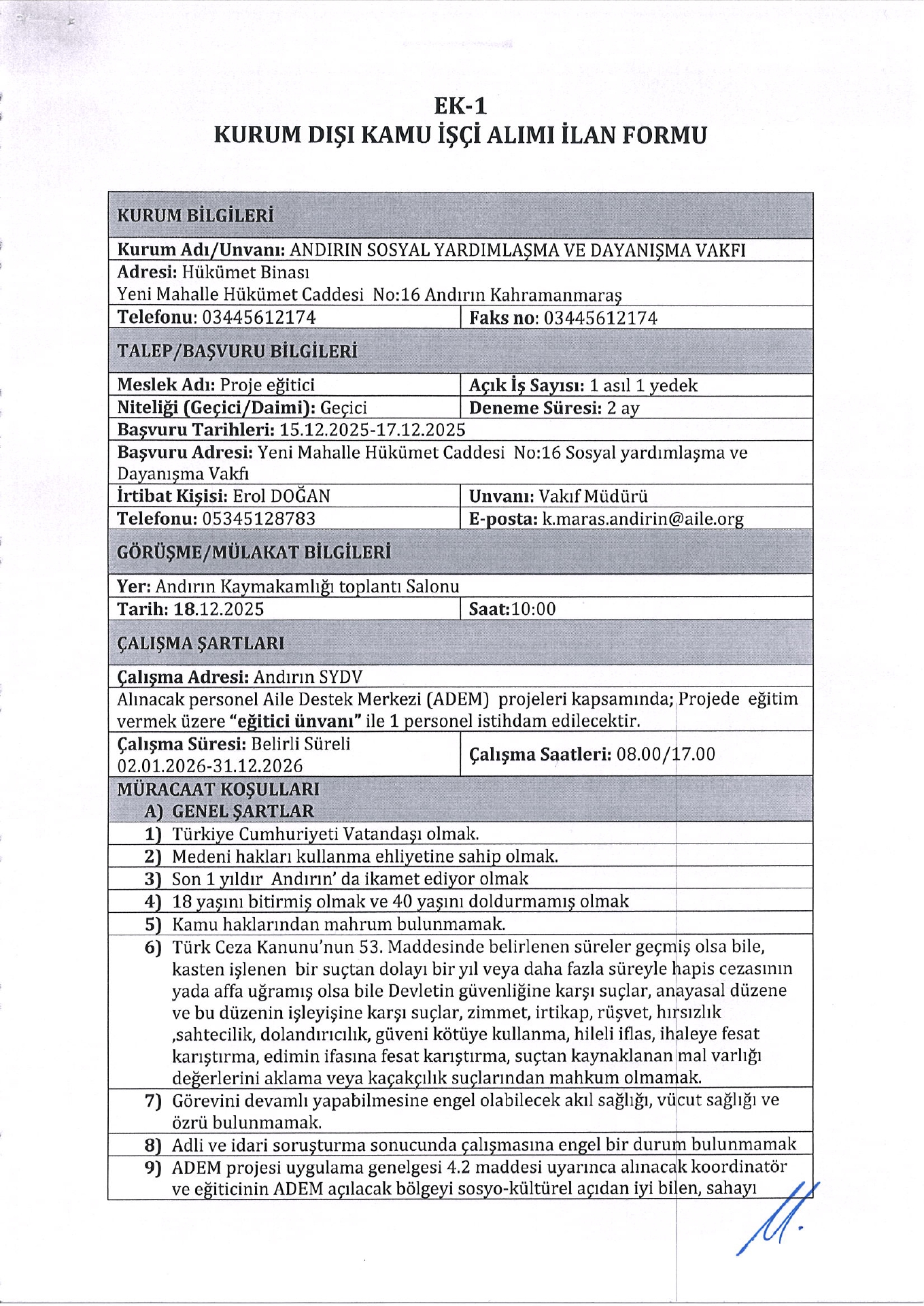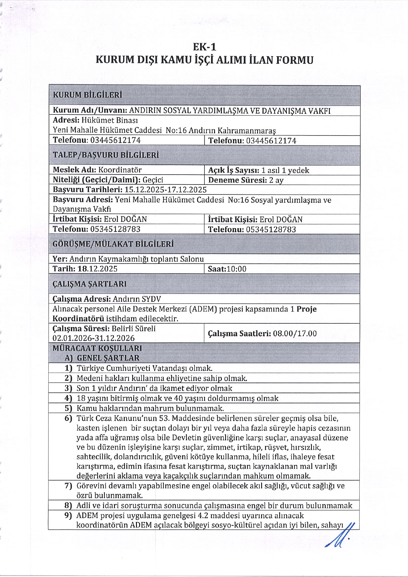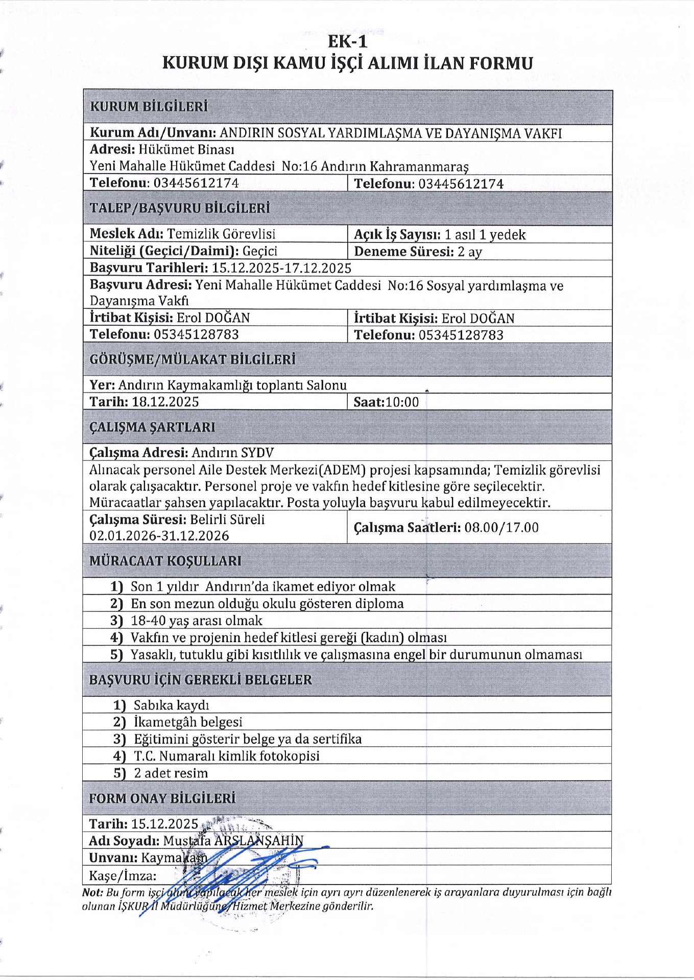 Kahramanmaraş Andırın SYDV Geçici 3 İşçi Alacak. Son başvuru tarihi 17 Aralık 2025