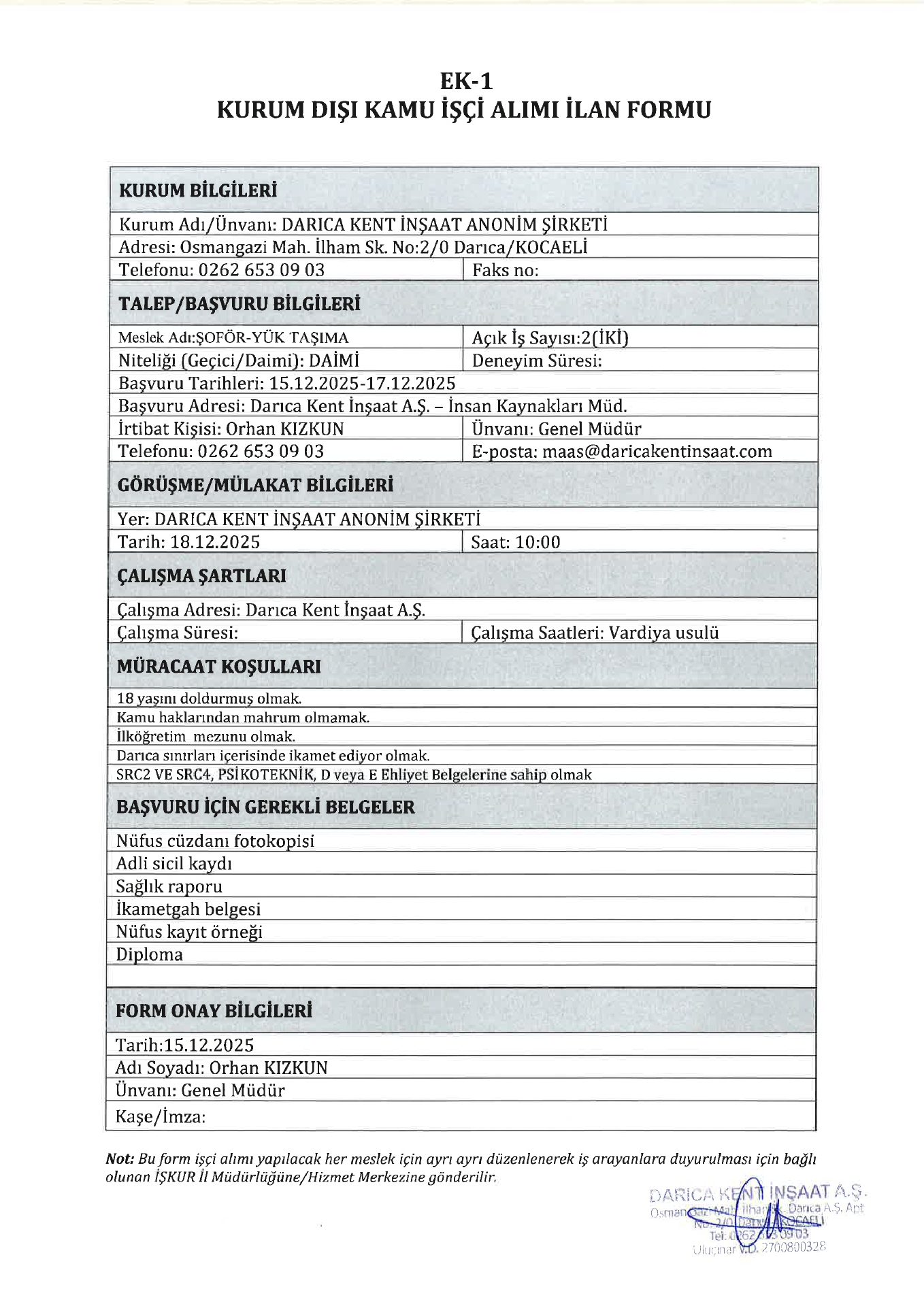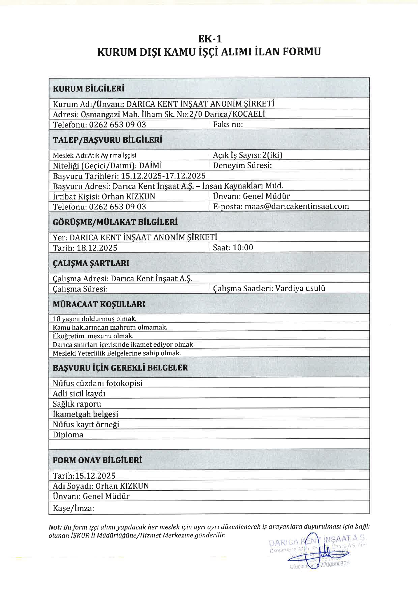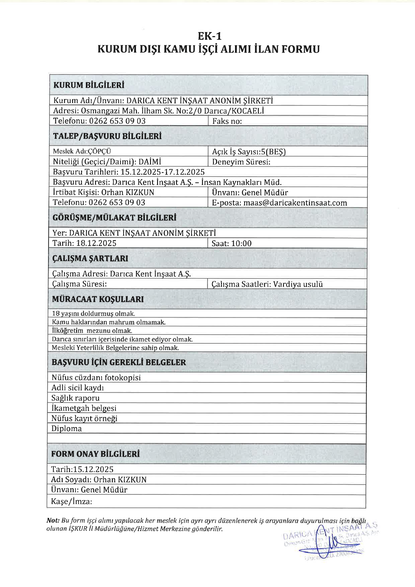 Ana sayfaDaimi İşçi İlanları Kocaeli Darıca Kent İnşaat 9 İşçi Alacak Kocaeli Darıca Kent İnşaat 9 İşçi Alacak. Son başvuru tarihi 17 Aralık 2025 Kaynak : İşkur İlan Giriş : 15 Aralık 2025 23:05, Son Güncelleme : 15 Aralık 2025 23:35 Yazdır Yorumlar (0) Abone Ol